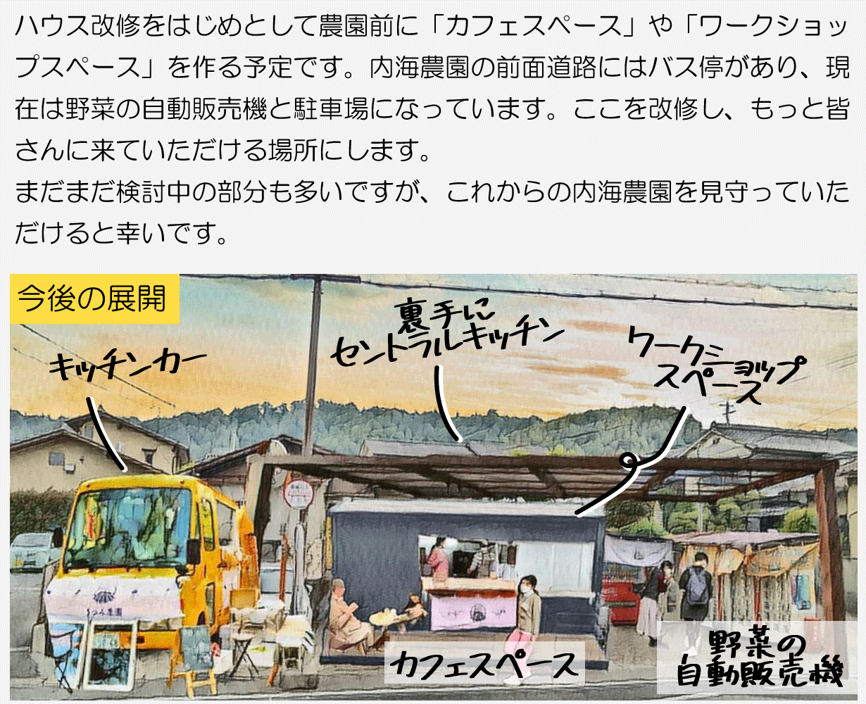 またハウス改修に続いてカフェスペースやワークショップスペース、イチゴ・京野菜の販売所、食に関するワークショップスペースを作ろうとしています。目指している「人が集まる楽しい農園」に一歩ずつ進んでいきます。今後とも内海農園をよろしくお願いいたします。