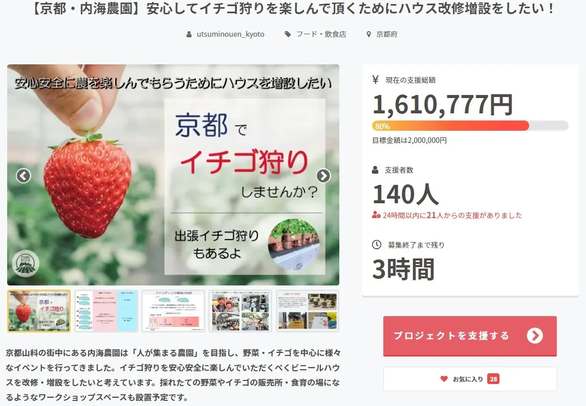 ついに160万突破しました!140名80%!1,610,777円!残り3時間!!