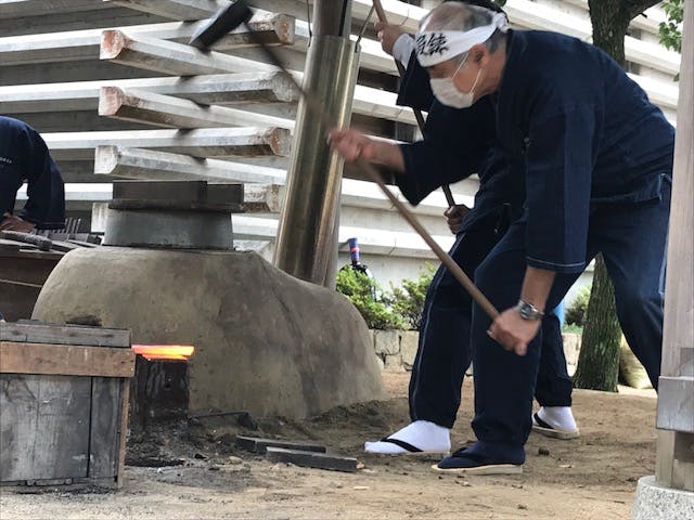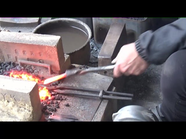 鍛錬(たんれん)は鉄を熱して大きな金鎚(かなづち)で叩いて薄く、強くする。