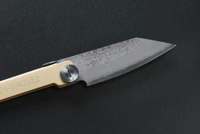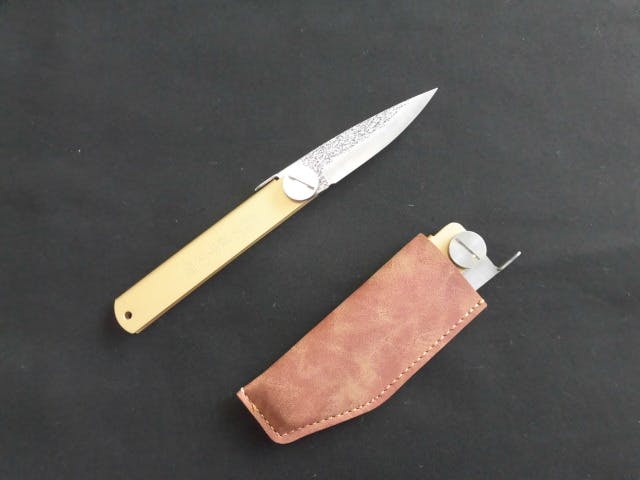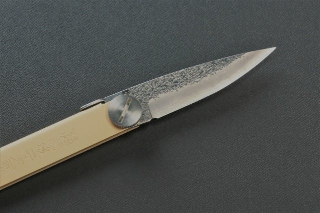 定番の真鍮材→ステンレス材で磨仕上げ→ステンレス材に真鍮メッキ仕上げにすることで、肥後守の製品であることを証明しています。