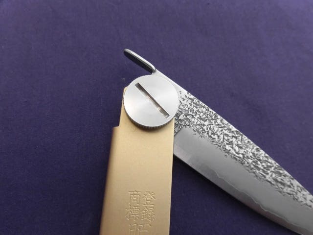 通常のカシメ止め→真鍮材ネジ式に→ステンレス材でネジ式にて大きく ギザを入れる事で道具が無くても締める、緩めるが可能になり肥後守としては初めての 分解可能な仕様ができました、さらに1円玉他が使える様にマイナスの溝を掘ることで強い締め付けができます。固く締まりすぎても簡単に緩められます。