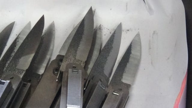 型抜き/鍛造(刃とチキリ)/焼き入れ/焼き戻し/歪取り/サヤ造り(刻印・曲げ・穴あけ・ガラ掛け・メッキ)/カシメ(ネジ式)/荒研磨/中研磨/刃先調整/試し切り/バフ磨き(試し切り)/研ぎ(刃調整)/仕上げ研ぎ/・・・包装。