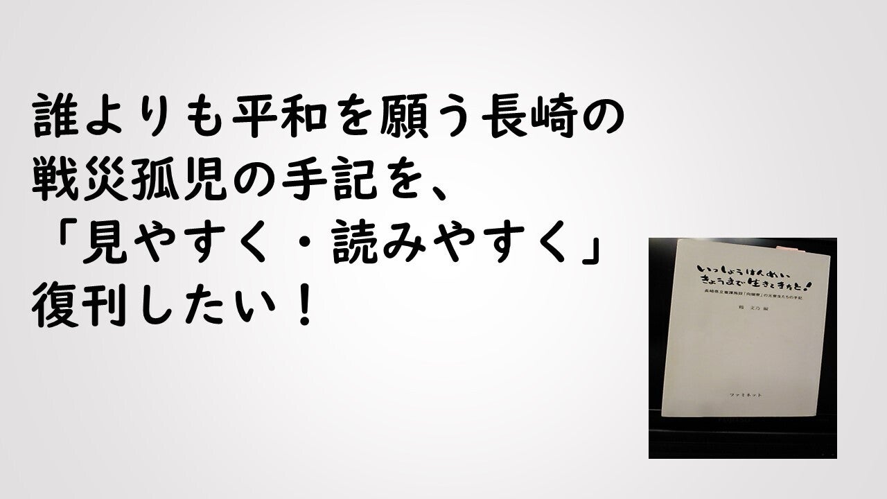なかなか知られることがないという点で弱視と共通する、「戦災孤児」について多くの方に知ってほしい! そんな思いを胸に、戦災孤児の手記の復刊をめざします! 応援よろしくお願いします!!