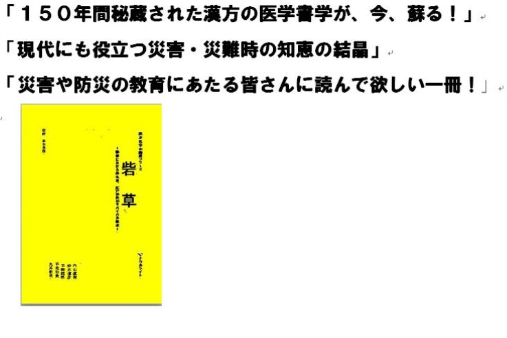 この内容を読んでみると緊急時の無医の状況の治療だけではなく、平時における不測の場合に備える事という意味を持つものであり、現代の災害時や予想できない非常事態における医療行為などにおいても汎用性の高いものもでもあることが分かってきました。