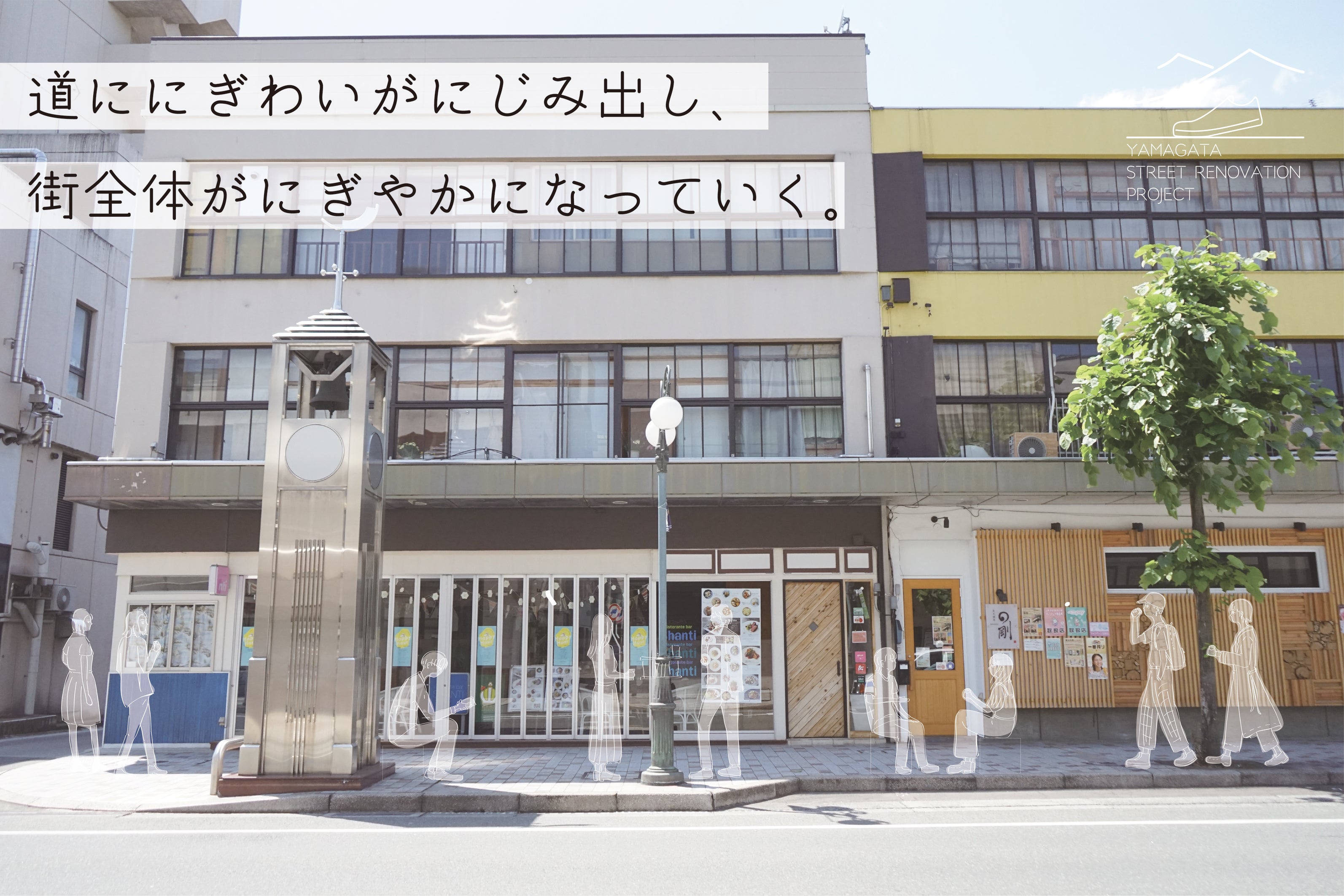 山形駅からもほど近く、昼は電車待ちの学生たちが、夜は飲みに来た大人たちが、心地よくたたずむことができる空間をつくろうとしています。