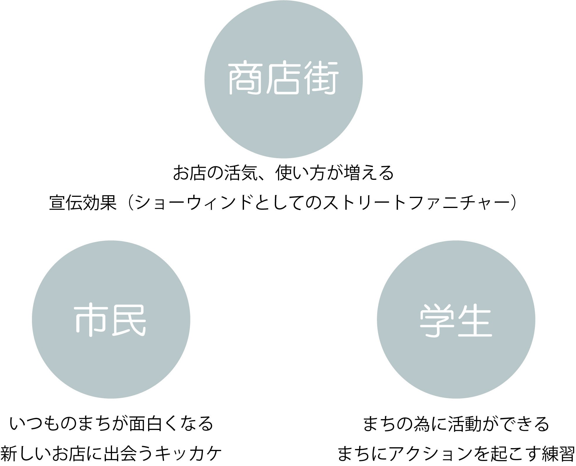また、街にストリートファニチャーという滞在場所が増えることで、散歩や、道での会話の機会が増える、そして今までお店の中で納まっていたにぎわいを道に滲み出させることができる。