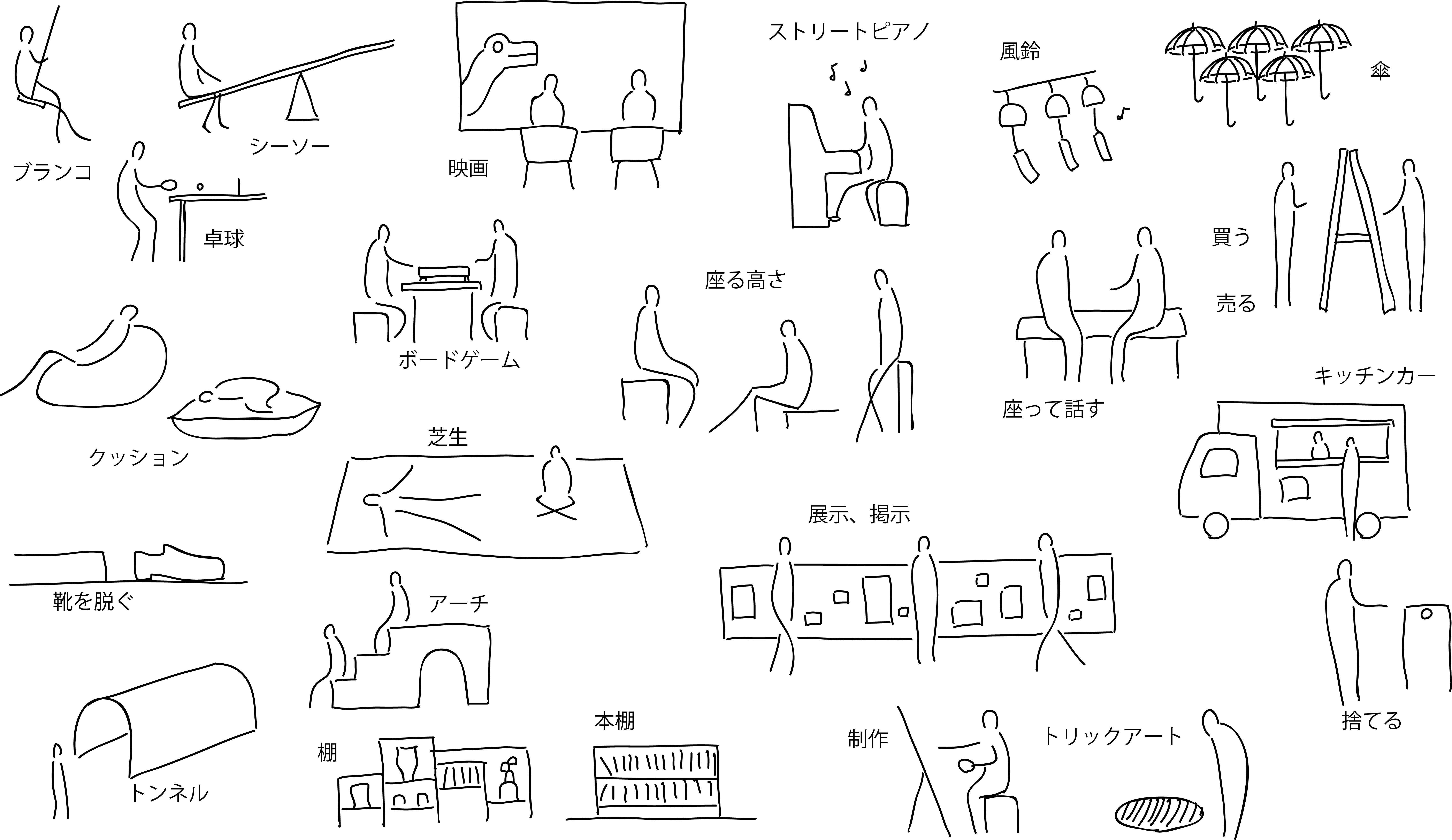 偶然の出会いによって、いつもはただすれ違っていた人とも、我々が考えたファニチャーをきっかけに会話が広がってゆく…そんな人と人との距離が近づくことでリアルな繋がりが生まれる楽しい空間を一緒に作りませんか?
