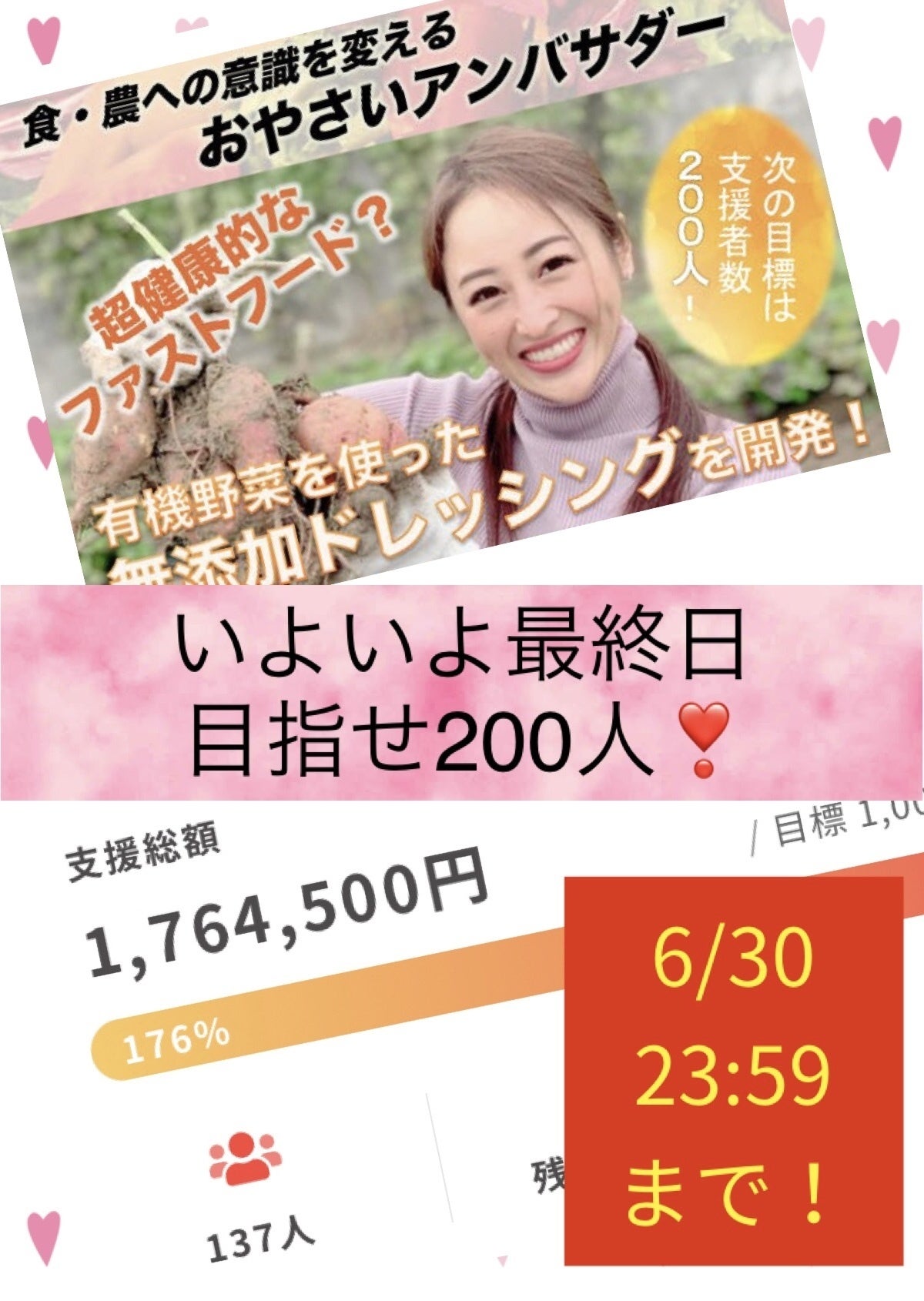 2022/06/30 11:27約1ヶ月走り続けたプロジェクトもいよいよ本日が最終日です。これまで応援いただいた皆さま、本当にありがとうございました!こんなにもたくさんの方々から励ましや応援の声をいただき、感動して胸が熱くなります。お野菜の素晴らしさを日本中に届けるため、本日6月30日の23:59まで、ご支援者様200人を目指して走りきります!最後の最後までどうか応援よろしくお願いいたします。プロジェクトページのシェア・拡散にもお力を貸してください。https://camp-fire.jp/projects/view/590588必ず達成したいと思っています。良い報告ができるように頑張ります!! もっと見る