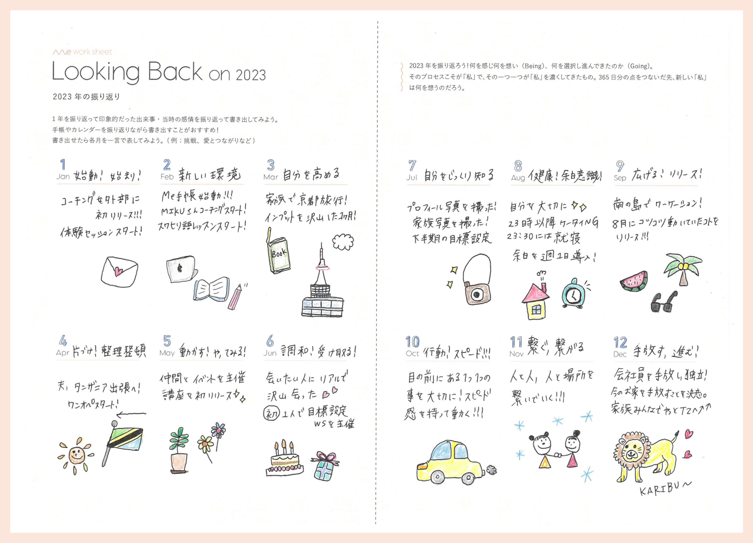 手帳を見ながら1年間歩いてきた道を振り返ることができるワーク。1年を振り返り、月ごとにテーマを書くことで、様々な経験や出会いに改めて感謝したり、自分の成長に気づくことができます。自分の歩いてきたプロセスを大切に、また次の踏み出したい一歩が見えてきます。