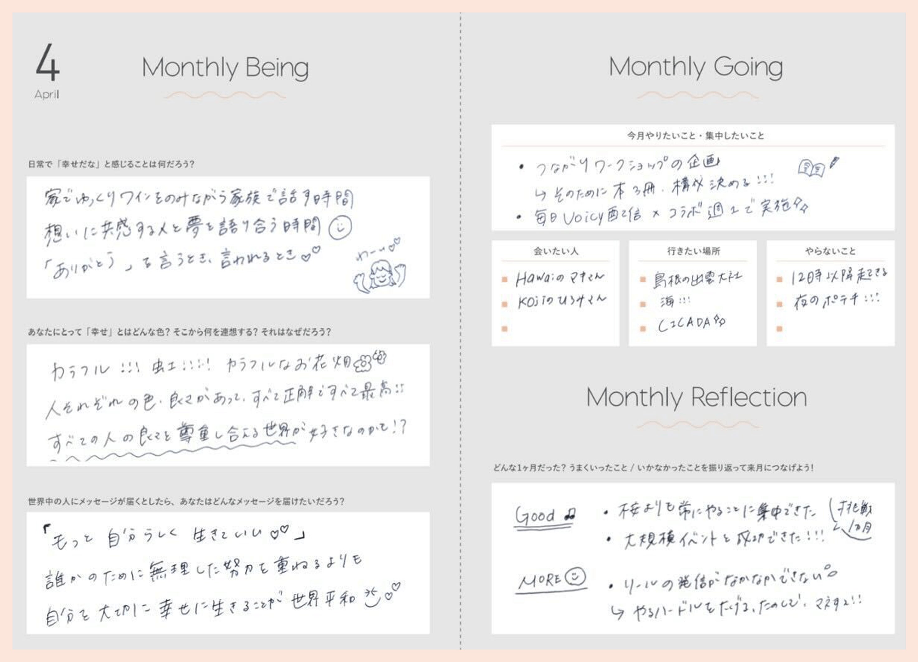 テーマに合わせた問いに答えるだけで、自分が大切にしている想いや価値観が見えてくる。毎月の目標設定も、具体的にイメージをすることでやることが明確になります。1ヶ月の終わりに振り返りをすることで、進んできたことに達成感を感じられるのもポイントです!