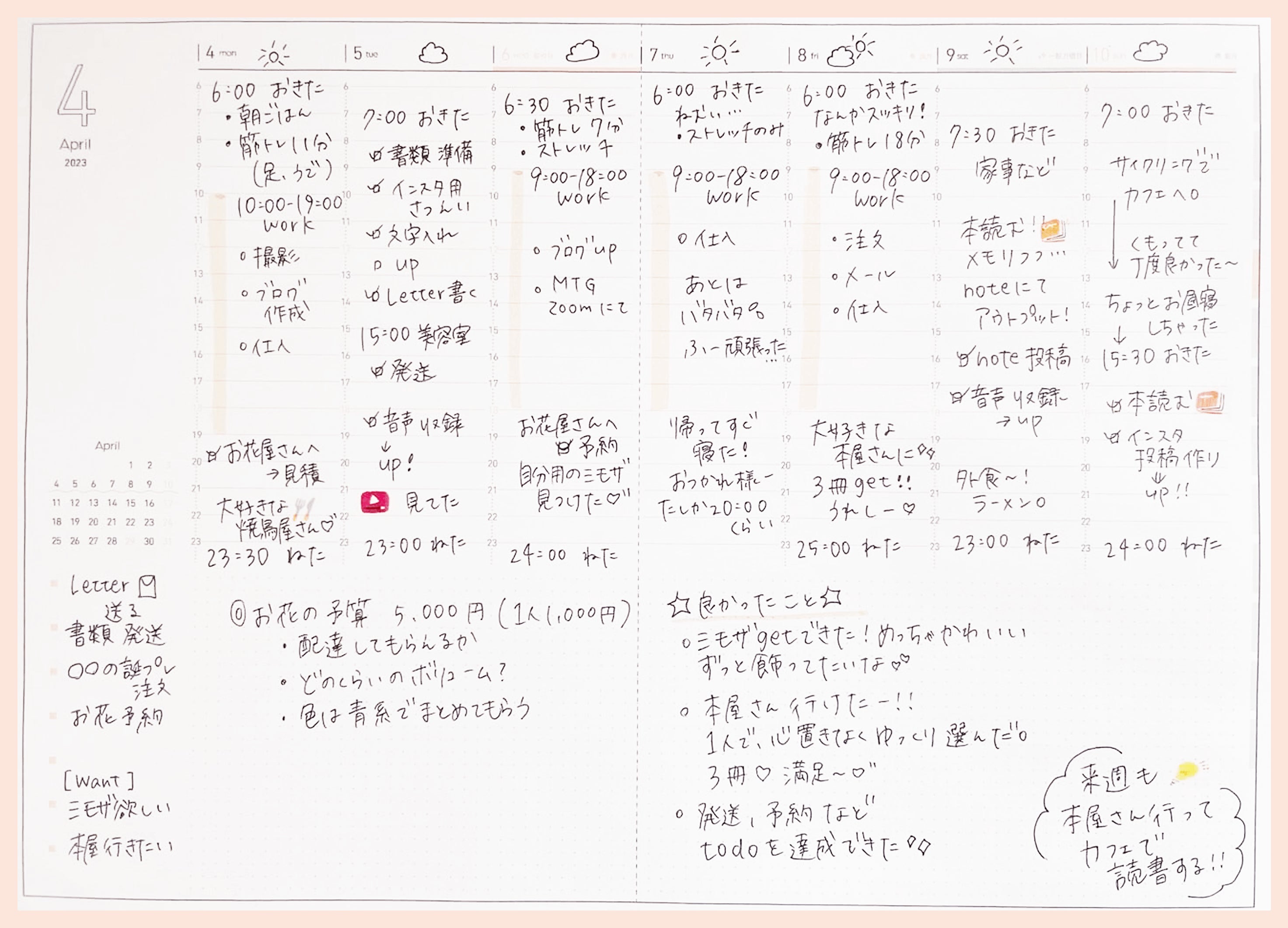 時間軸が6−23時と活動時間帯に合わせて活用しやすいウィークリー。週の初めに1週間のやりたいことをまとめることで、充実した日々を過ごすことができます。自由度の高いメモは、日々のタスク管理、日記を書いたりカスタマイズが可能です◎