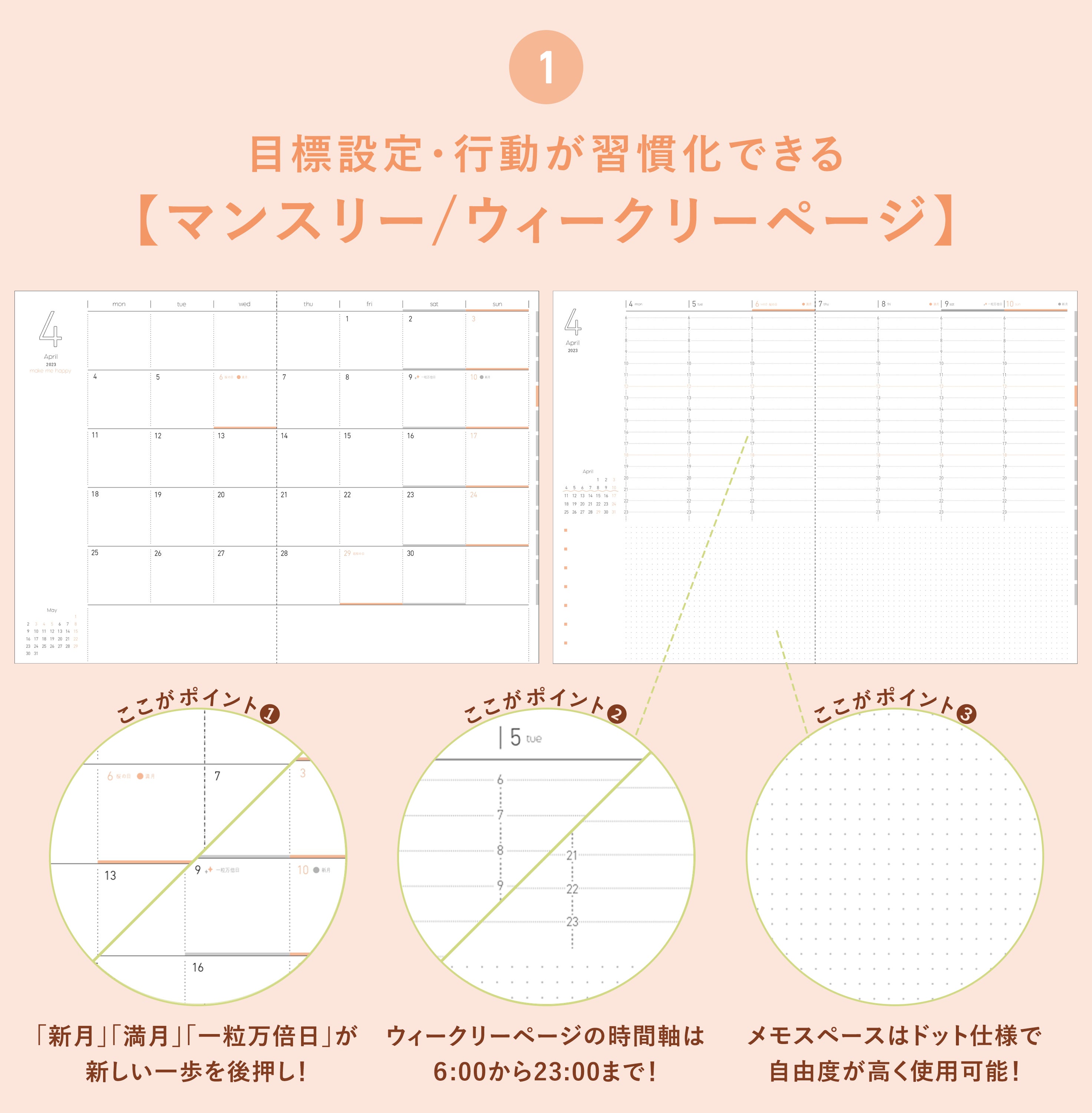 何十冊も手帳を使ってきたメンバーが、線の太さ・枠の大きさなど、細部までこだわって制作したマンスリー・セミバーチカルのウィークリー。タスクや時間管理・日々の記録など、用途に合わせて使える自由度の高さと余白の多さもポイントです。夢や理想をそのままで終わらせず、行動を習慣化するまでをサポートします。