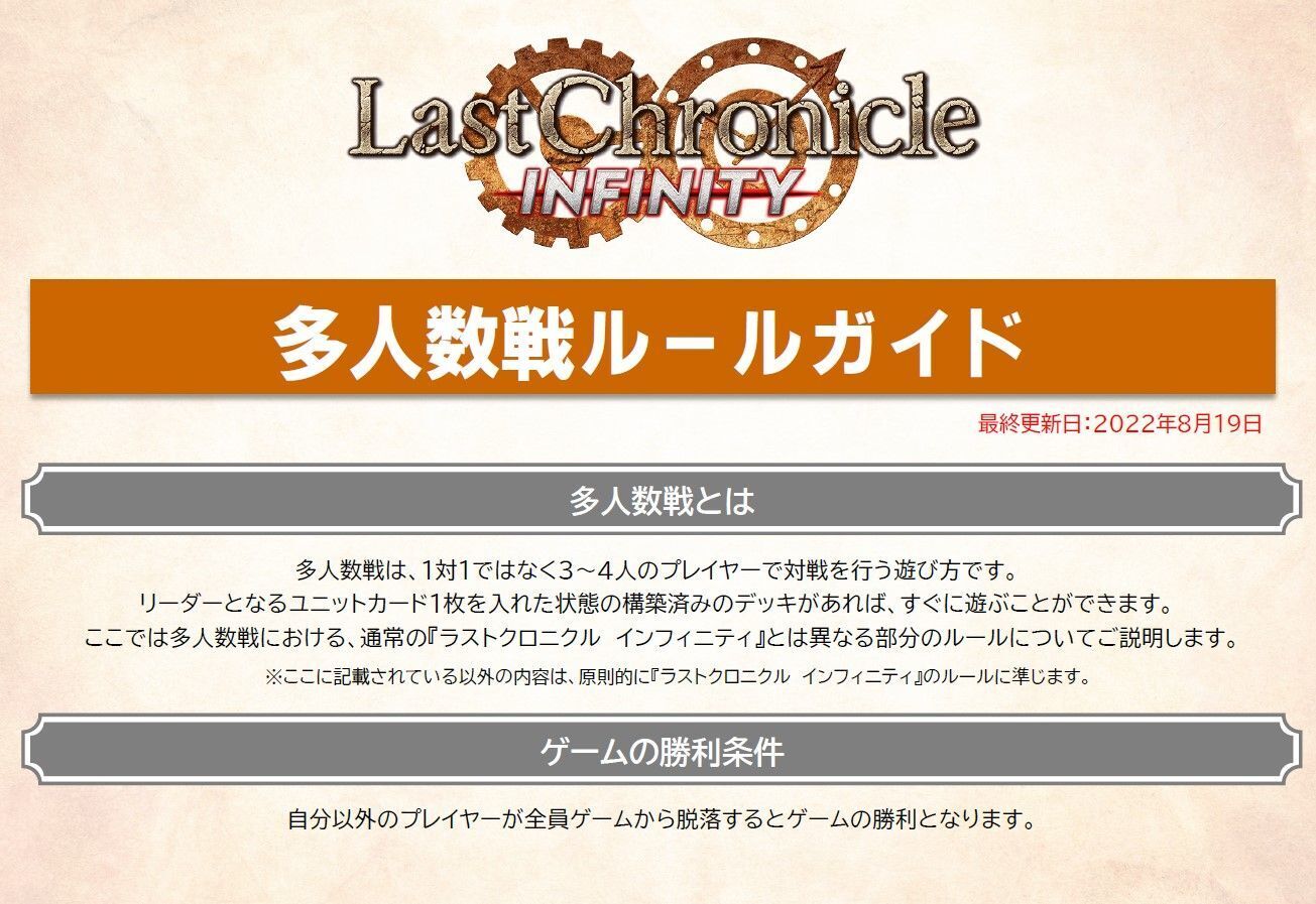 「多人数戦ルールガイド」を掲載しました! 3~4人で同時にプレイできる、ラスクロインフィニティの新しい遊びかたです。 詳細は公式サイトのルールページよりダウンロードしてご覧ください。https://t.co/kmQLSRI5tuこの多人数戦については9月24日より開催の「無限祭2022秋」で対戦イベントを行う予定です。 来週にはイベントの詳細発表ならびに事前エントリーを開始しますので、楽しみにお待ちください!■無限祭 秋■ https://t.co/bWuTy3JQGe