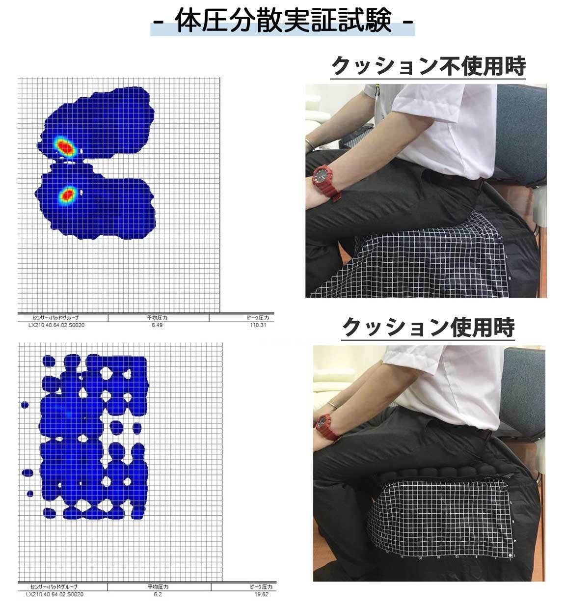 圧力測定ができるX3 SPK PROシートを椅子に敷いて実証実験をした結果、クッション不使用時の最大圧力110.31kPaに対しクッション使用時の最大圧力は19.62kPaと約8割近い圧力が分散されている驚きの結果が出ました。