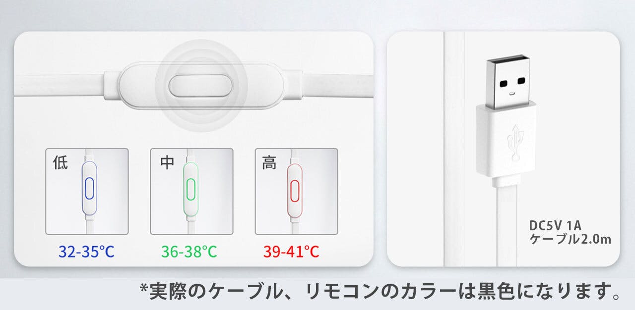 グラフェンヒーター使用時は本体に繋がっているUSB-A端子から電源供給を行って下さい、ケーブルには3段階の温度調整が可能なリモコンが付いていますのでそこで弱・中・強と調整できます。