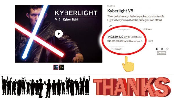 V5カイバーライトはおかげさまで海外のクラウドファンディングで1000名以上のご支援者に約5,000万円のご支援を頂きました。