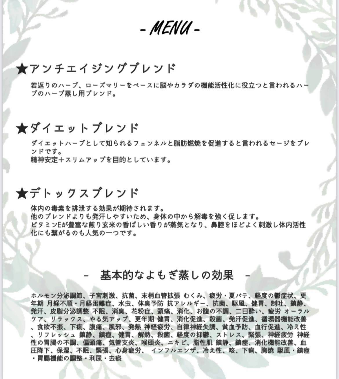 参考までによもぎ蒸しの基本的効果と、当店で扱っているハーブを添付させて頂きます。宜しくお願い致します!