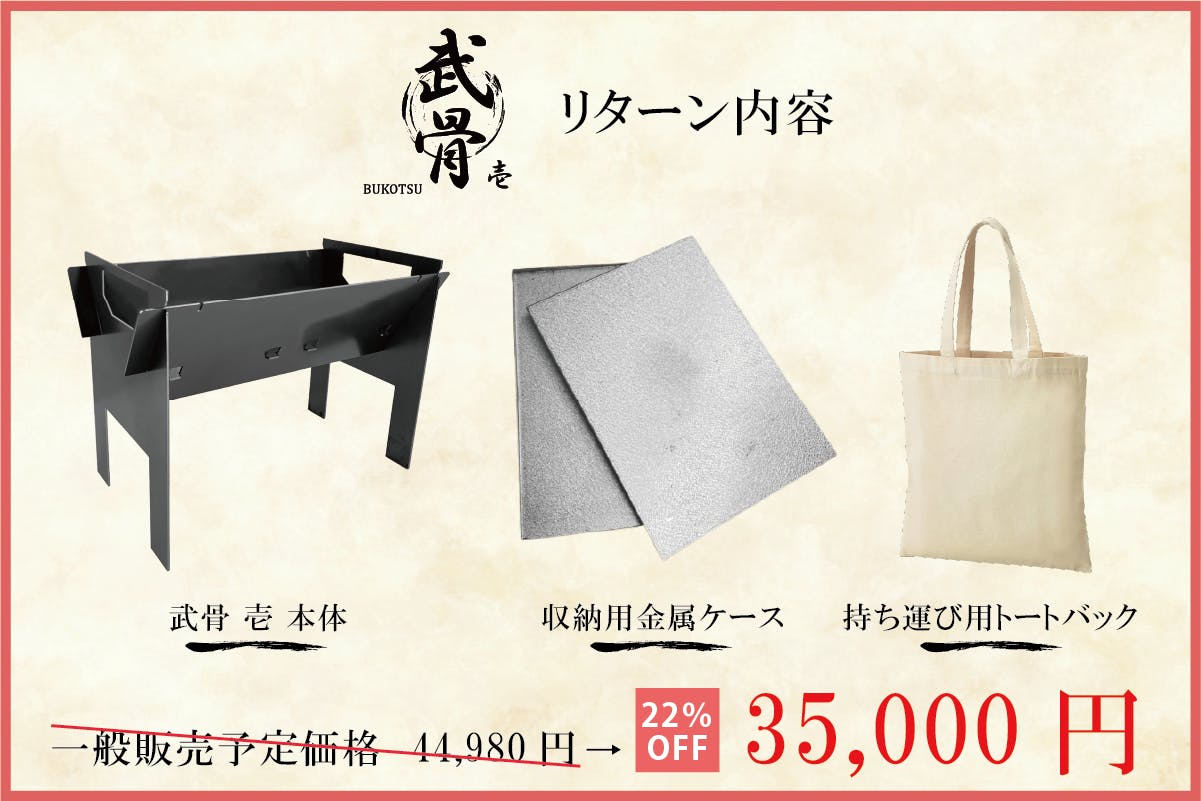 武骨壱の本体、収納用金属ケース、持ち運び用トートバックのセットを一般販売予定価格44,980円のところ、リターンセット限定価格として22%オフの35,000円でご提供いたします!