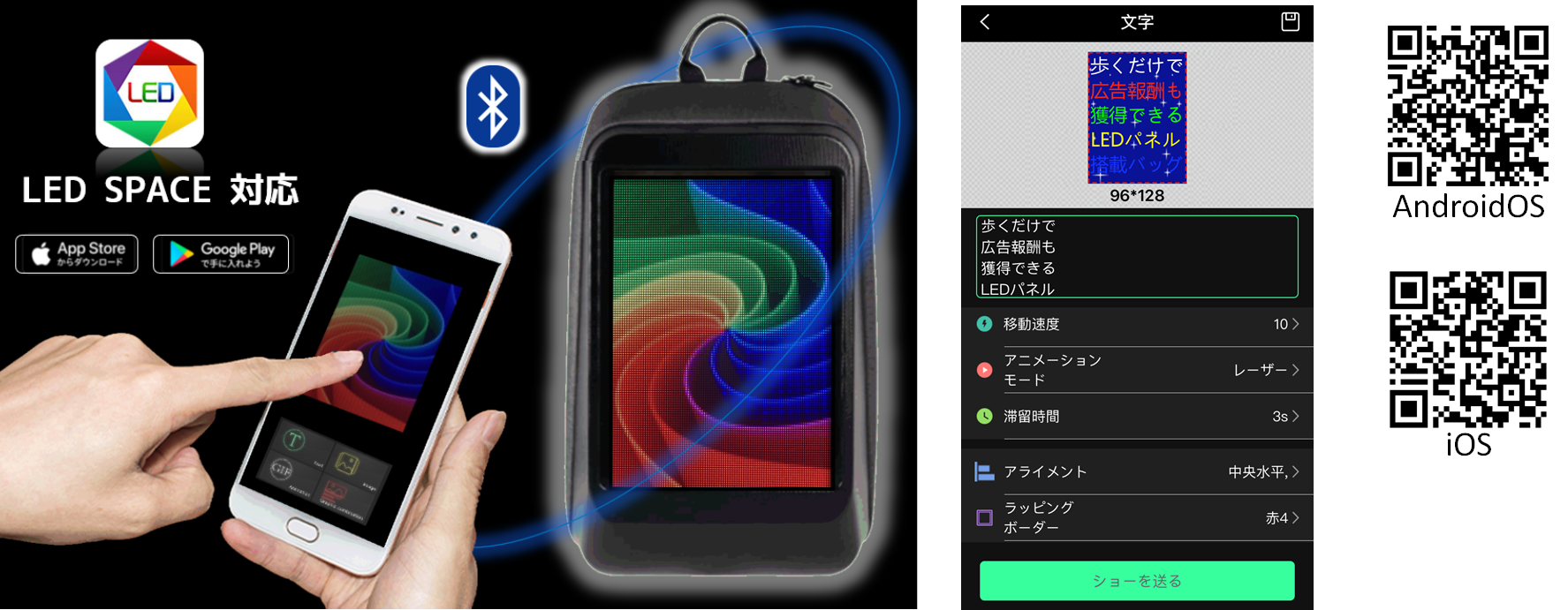 LEDパネル編集アプリLED Spaceは、スマホとLEDバッグをBluetoothで接続して、スマホに保存してある画像や、アニメーション、カラフルなテキスト、楽しい落書き、その他のプログラムを作成して表示できます。(日本語対応)