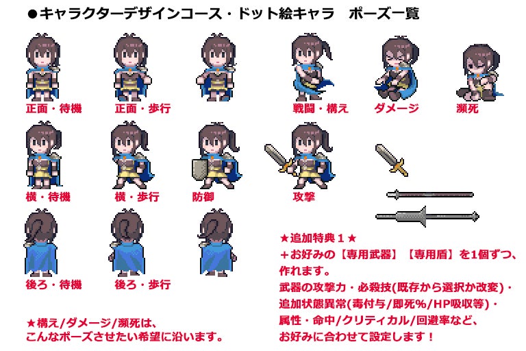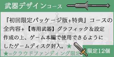 好きな武器グラフィック(ドット絵武器)作成および、武器設定(攻撃力・必殺技(既存から選択か改変)・追加状態異常(毒付与/即死%/HP吸収等)・属性・命中/クリティカル/回避率など)の上、ゲーム本編でプレイできるようにしたゲームディスクが封入されます。あなただけの特別バージョンになります。