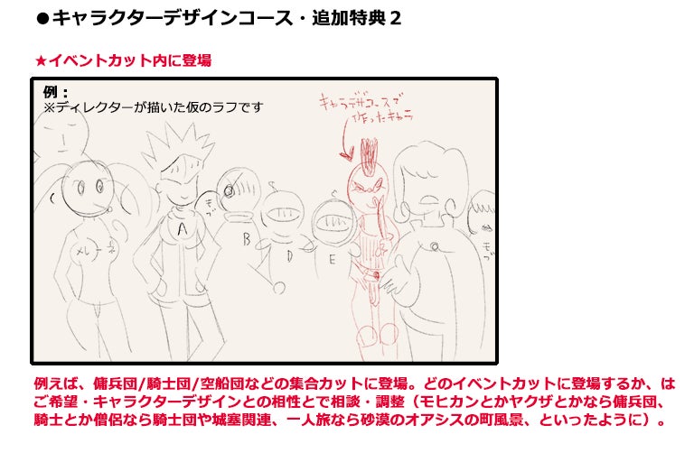 例えばこのように傭兵団集合のイベントカットに、キャラデザコースで作成したキャラを登場させることが可能ということになります。