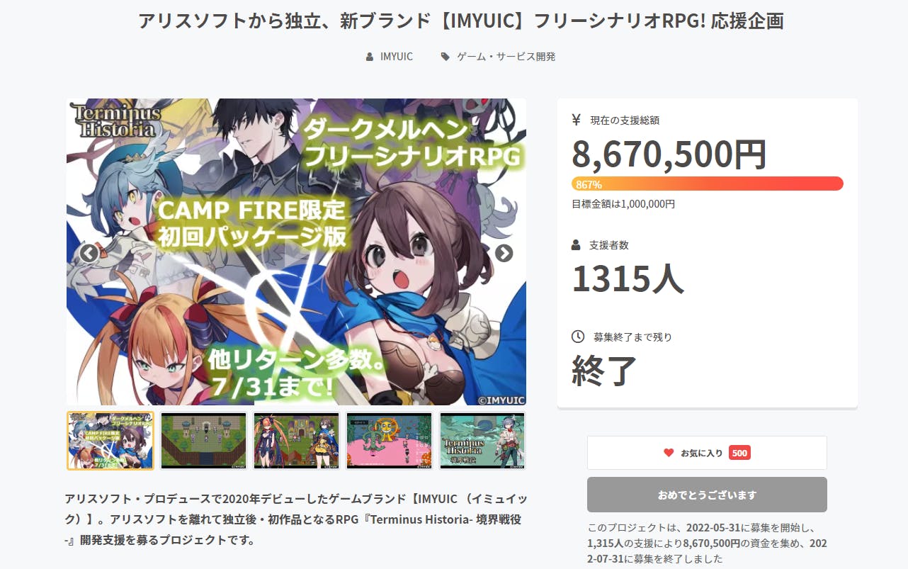 期間中は、広報およびゲームやリターンに関するお問い合わせへのご返答に手一杯となっておりましたので、これから、頂いているメッセージやお問い合わせへ順次ご返答させて頂きます。内容によっては少々、お時間を頂くかもしれません。必ずご返答は致しますので、お待ちください。(もしご返答がないままであったり、DMが既読にならない等ありましたら、通知が届いておらず開封していない等の可能性もありますので、お手数をおかけ致しますがCAMP FIREのメッセージ機能を利用するなどして再送ください。)