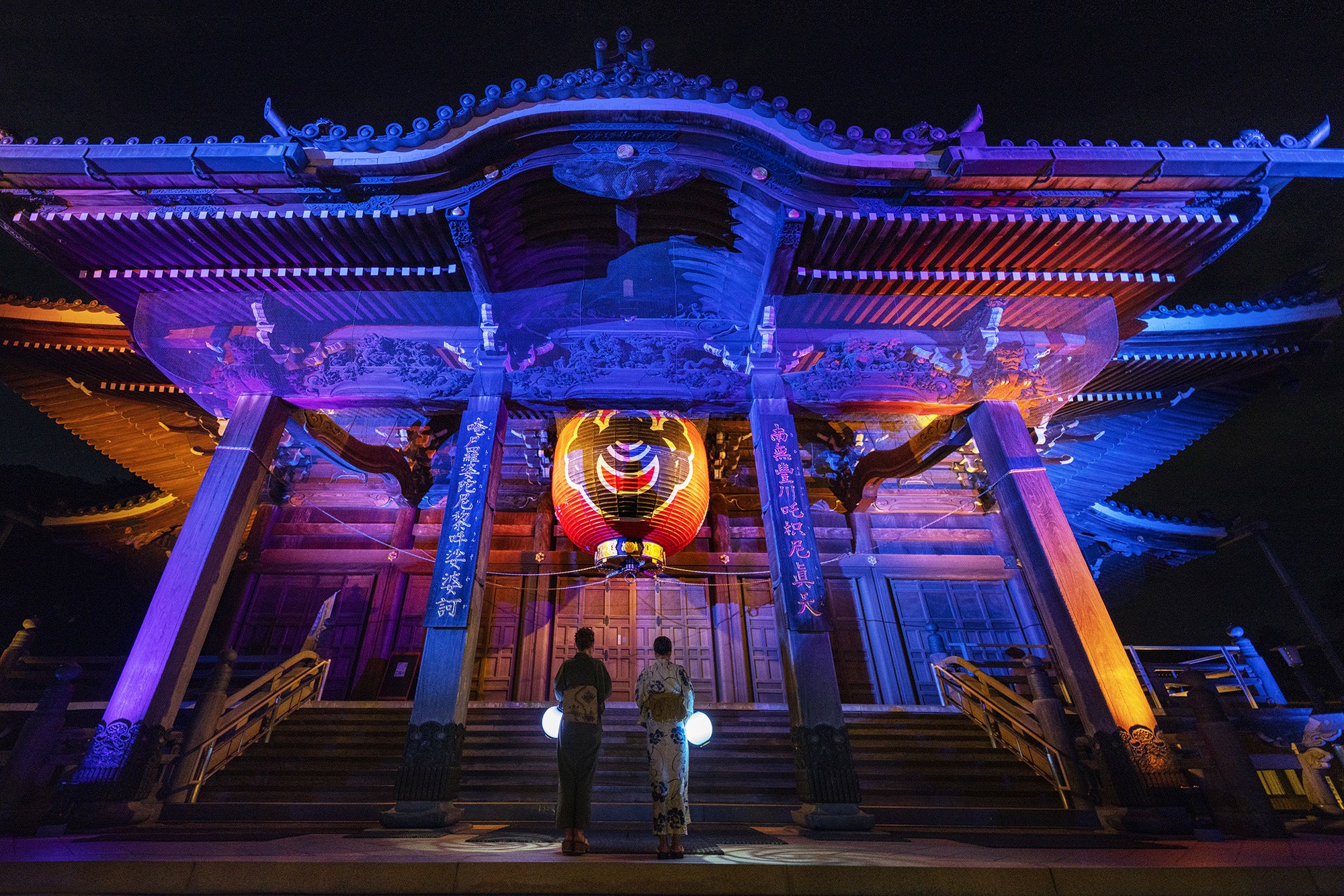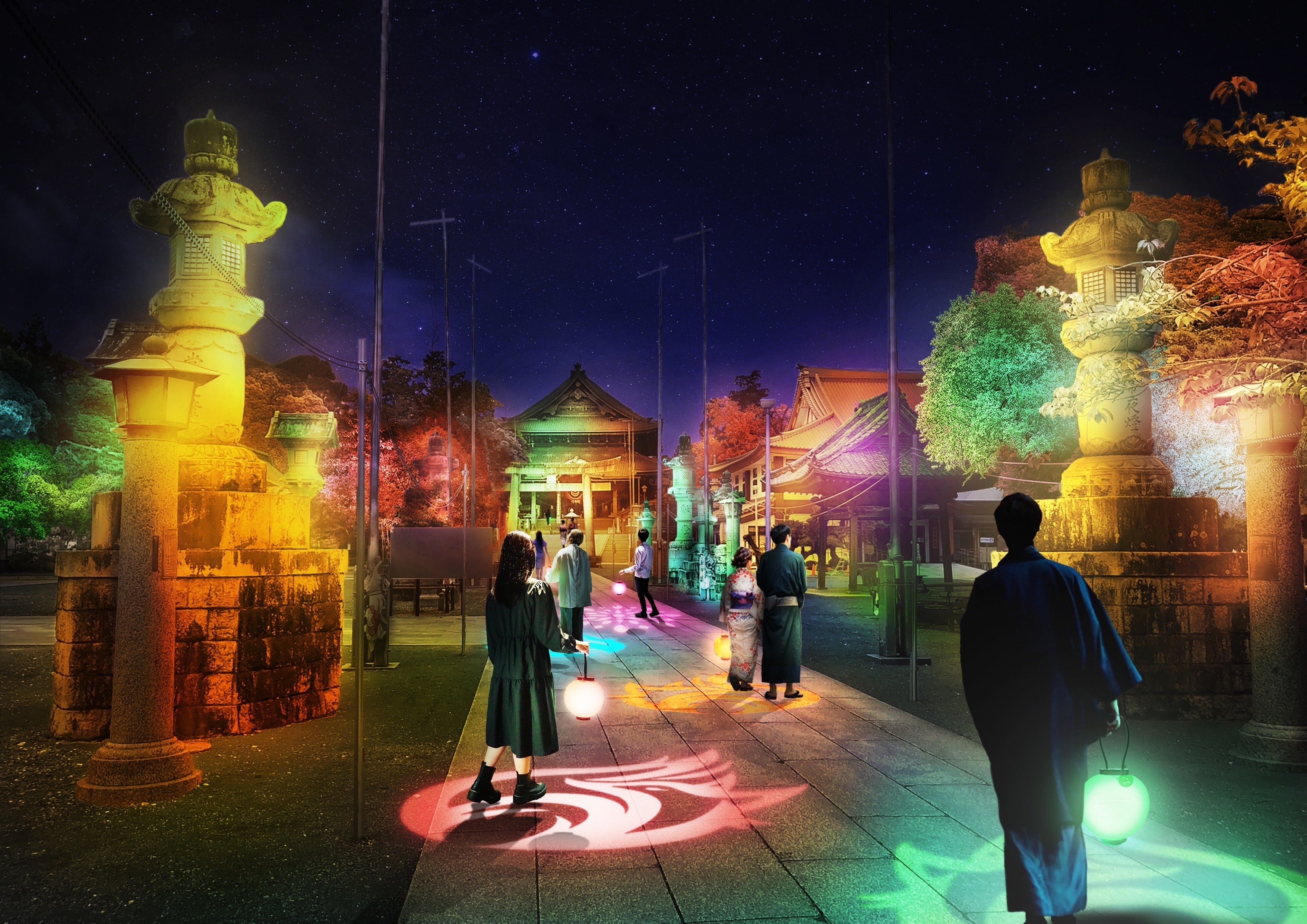 ・参道ライトアップ-光の響縁・・・提灯の灯りと大本殿までの参道ライトアップが響き合い、その時その瞬間に居合わせた参拝者たちと創り出す一期一会を表現。提灯と境内の光で空間が一体になることで、周りとの繋がりへの意識やご縁への気付きに。今回は、夏の特別期間限定でSUMMERカラーバージョンに変化する予定。