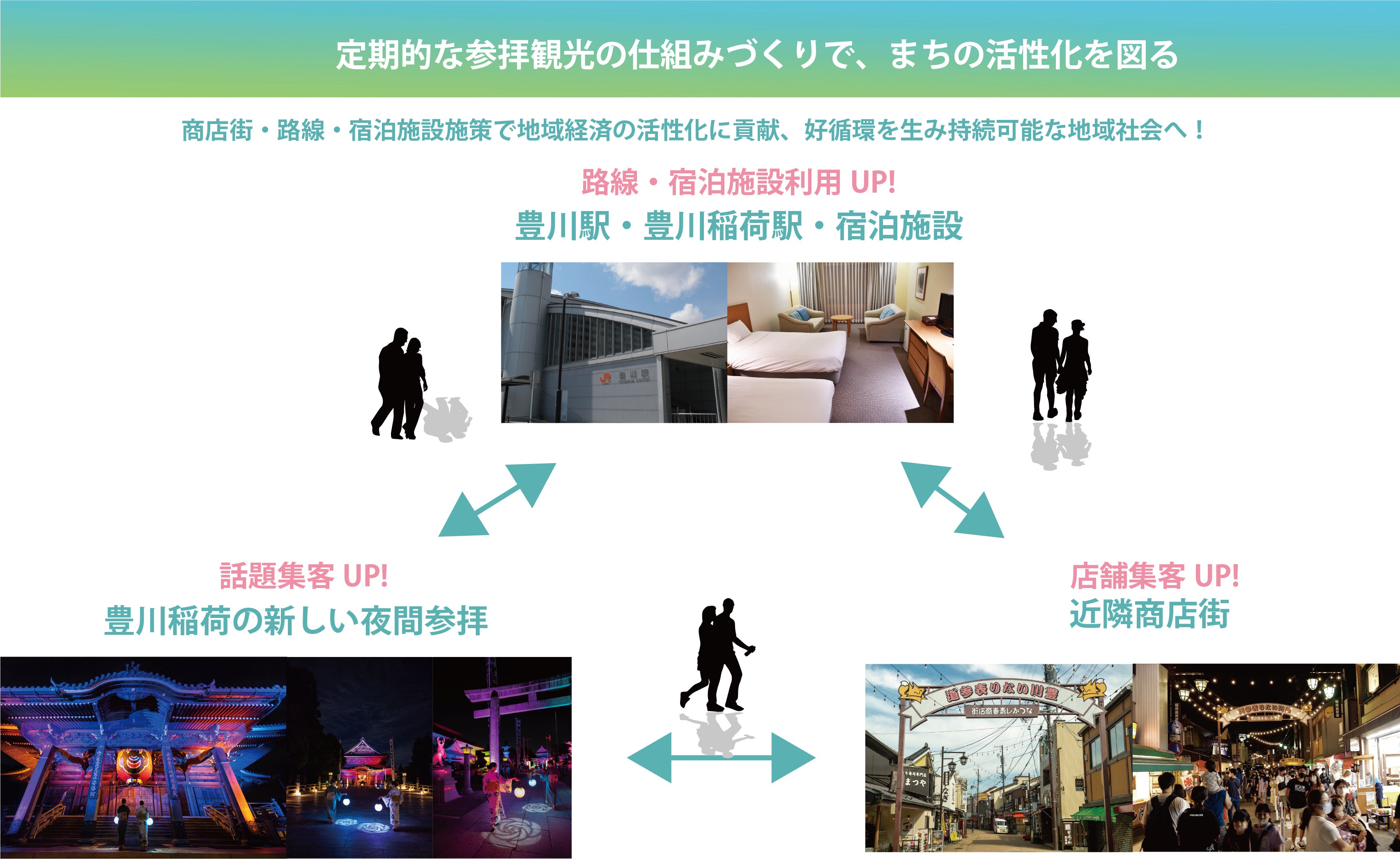 将来的なインバウンドの起爆剤として豊川の新たな観光資源となるよう、資金を集め、光設備を豊川稲荷に常設奉納、話題づくりとして着物詣等の特別企画を開催する活動や、地域や企業と連携したプラン構築などを行っています。