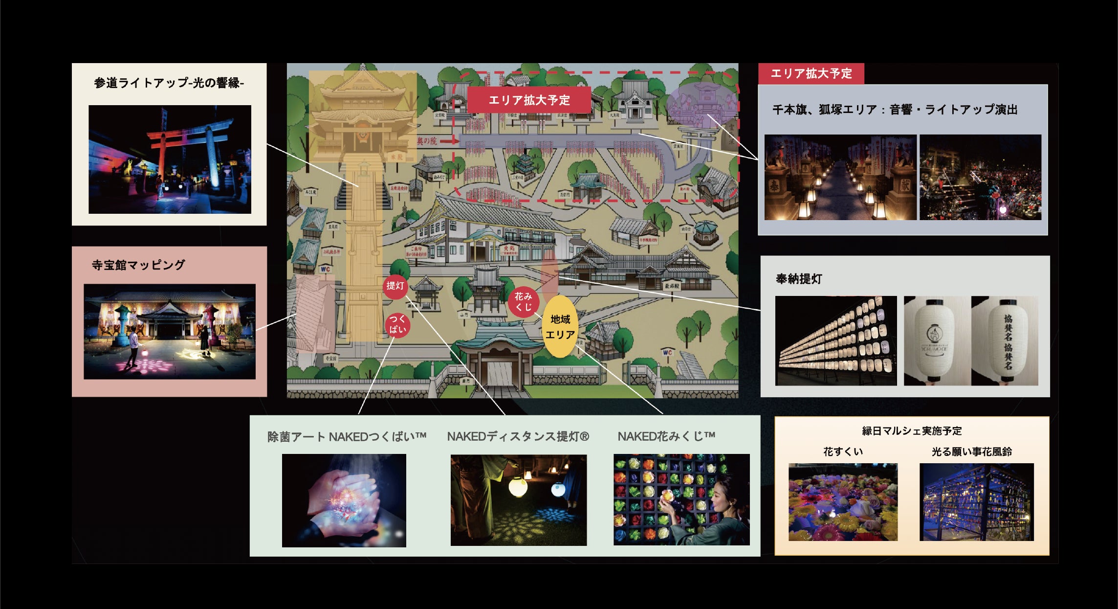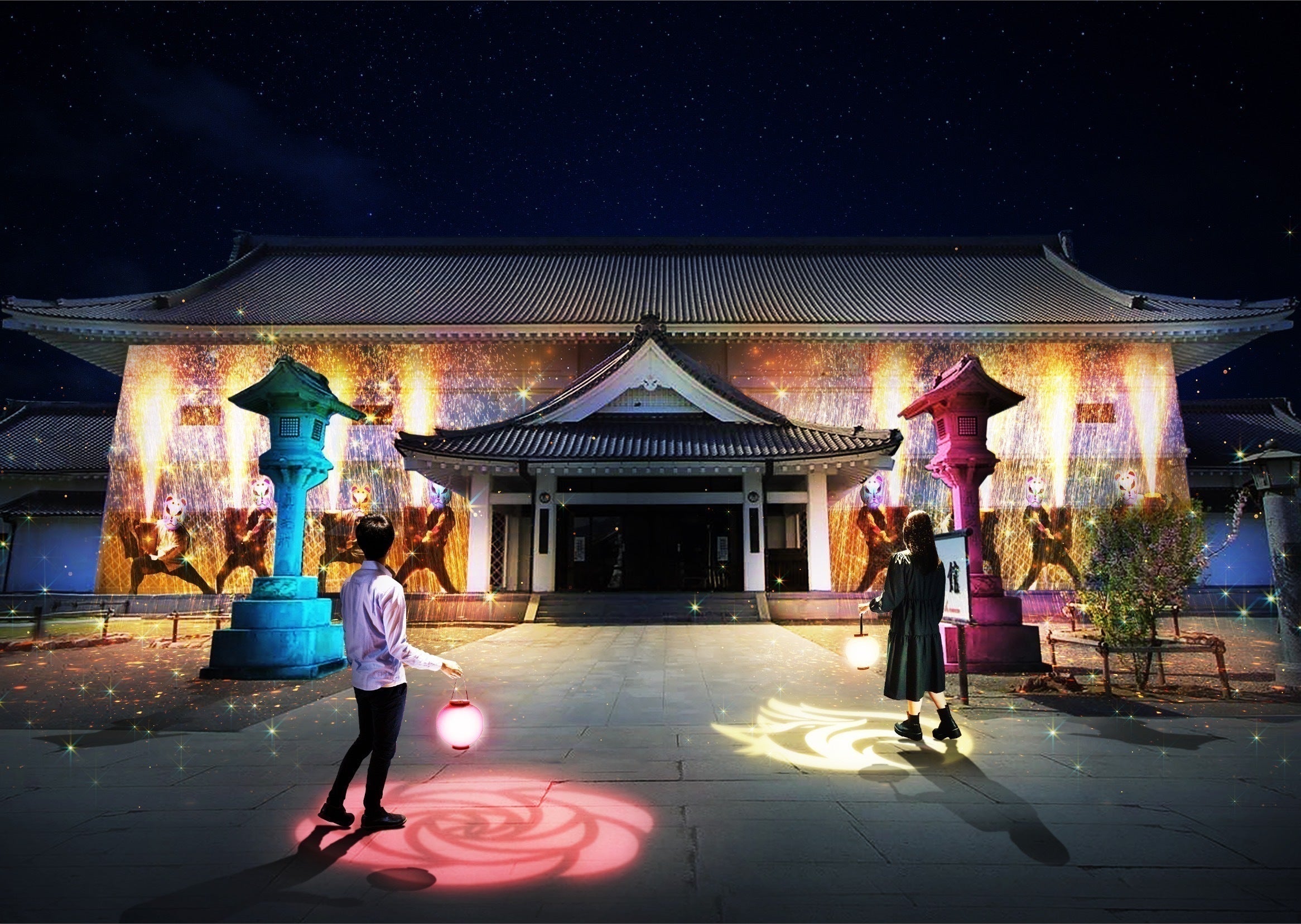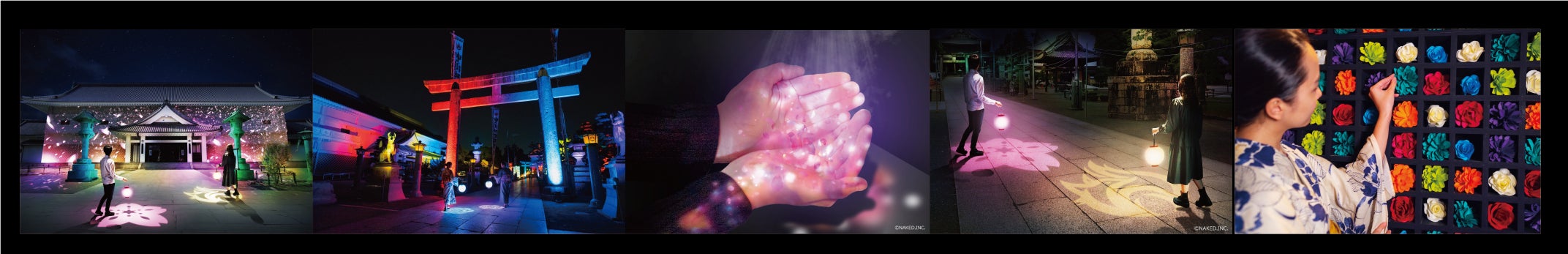 ・NAKED感染症予防対策アート「NAKEDディスタンス提灯® 」・・・提灯から足元に映しだされる光の模様で、自然とソーシャルディスタンスをキープしながら自分自身も光の演出に参加しながら参拝できるアイテム。今回は昨年から大人気の白虎の模様、さらに夏の特別期間限定で花火模様の提灯が登場予定。