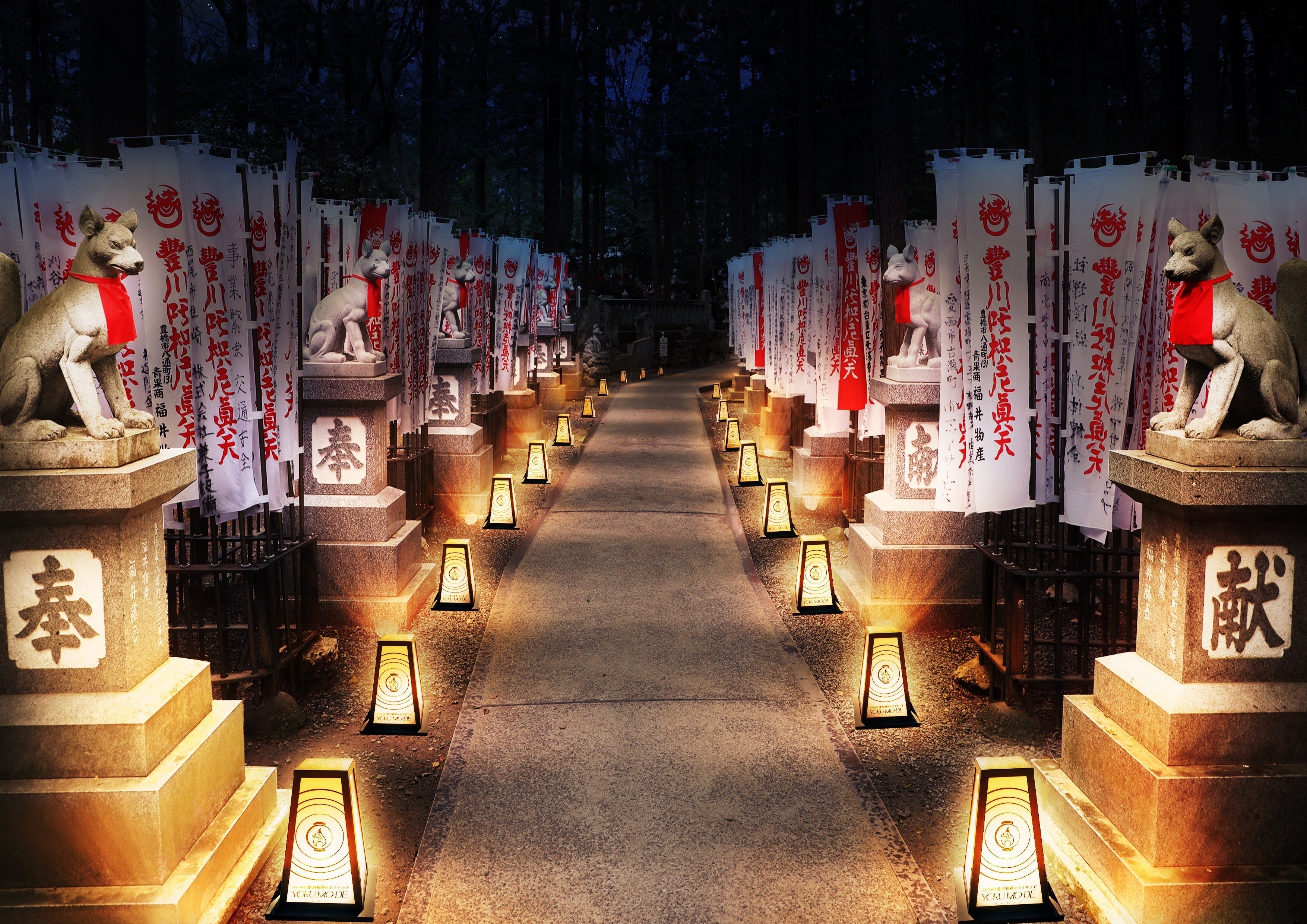 ・奥の院参道「狐の灯」・・・今回新たに拡大するご縁日の新エリア。霊狐塚への道のりをライトアップと音の演出により導いていく。道のりを彩る紅白の幟は、全国より参拝にみえた御信者方が奉納されたもので、その数の多さから通称、千本幟と呼ばれている。YORU MO-DE(ヨルモウデ)にご支援いただいた地域の方々の力で豊川稲荷に灯りを供える行灯が参道沿いに並ぶ予定。