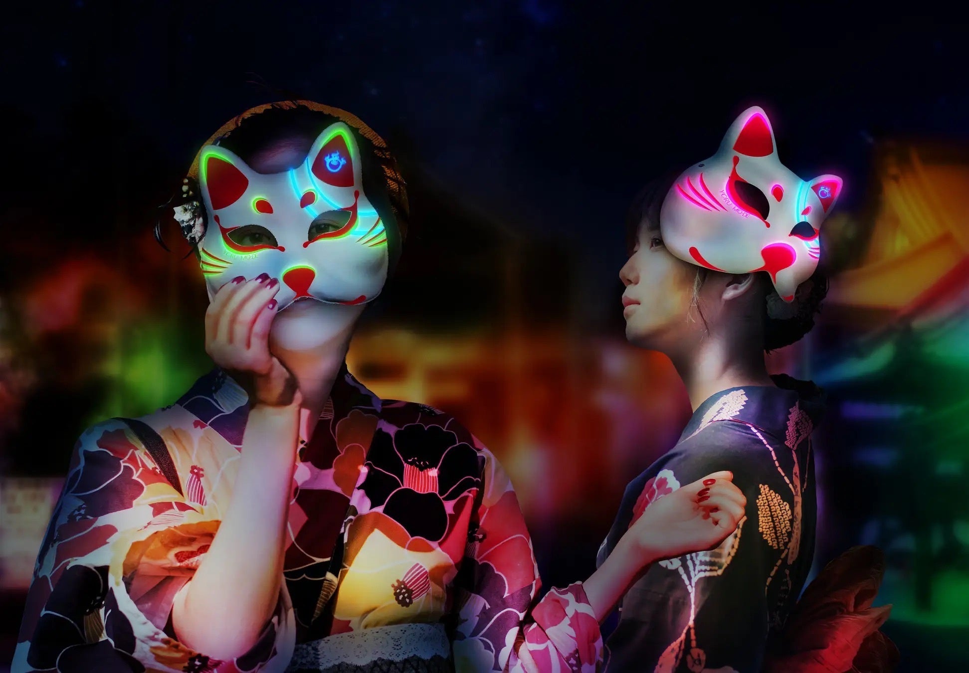 ・「FOX MASK」※数量限定販売・・・東三河で活動する作家、クリエイターが月に一度、豊川稲荷で行っている「豊川手しごと市(代表 佐藤勝亮)とコラボレーションしたお面『FOX MASK』が昨年夏ぶりにハーフタイプで再登場。夜になると蓄光で光り輝く、ヨルモウデの公式マスクアイテム。