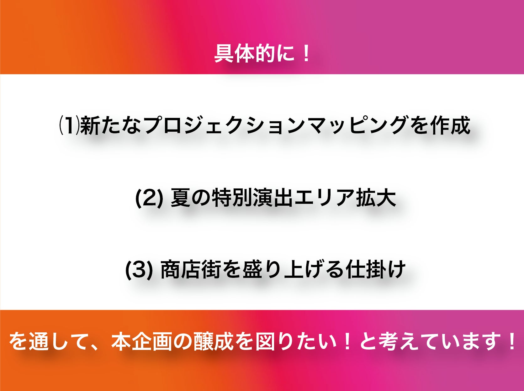 新型コロナウイルス感染拡大以降、本年度も地元の伝統的な祭りである、おいでん祭や、みたま祭りなど多数見送られる状況となっています。縁日参りプロジェクト実行委員会2022では、累計5万人以上が来場し大きな話題となっているヨルモウデ 夏の特別期間開期中、「新時代の夏祭り」をテーマに、プロジェクションマッピング等の特別演出や、豊川稲荷、近隣商店街、後援団体や企業と三位一体となり、豊川ならではの夏の特別体験を共創し、さらなる賑わいを創出したいと考えています。
