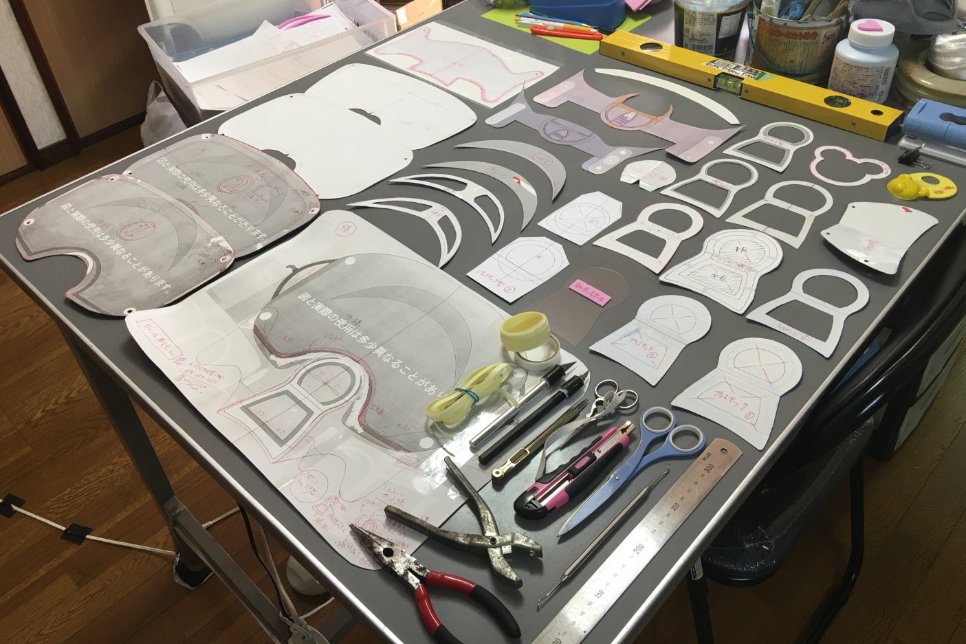 えり、ゆうこさん、社長の三人で作っています。全て手作業で作っているのに社長が品質にこだわるあまり、とにかく時間がかかります。型に合わせてのプラ板の切り抜き、スポンジシートの切り抜きに始まり、3種のフィルターシートの切り抜き張り合わせ、組み立てと続きますが、手作業なのでそんなにきれいにいきません。ところが、そこにこだわるのが社長です。自分のやってる分はとにかくきれいにきれいに工業製品に見えるように切って作っていきます。やっぱり手の限界がありますから、社長がもっと良い物や進んだ物を作りたくても今が限界です。それに、接着するにしても両面テープで貼るにしてもとにかく細かい気を遣う作業でとても時間がかかり、目、肩、腰がやられます。フリマのためにマスク2つ作った翌日の社長は死んでました。