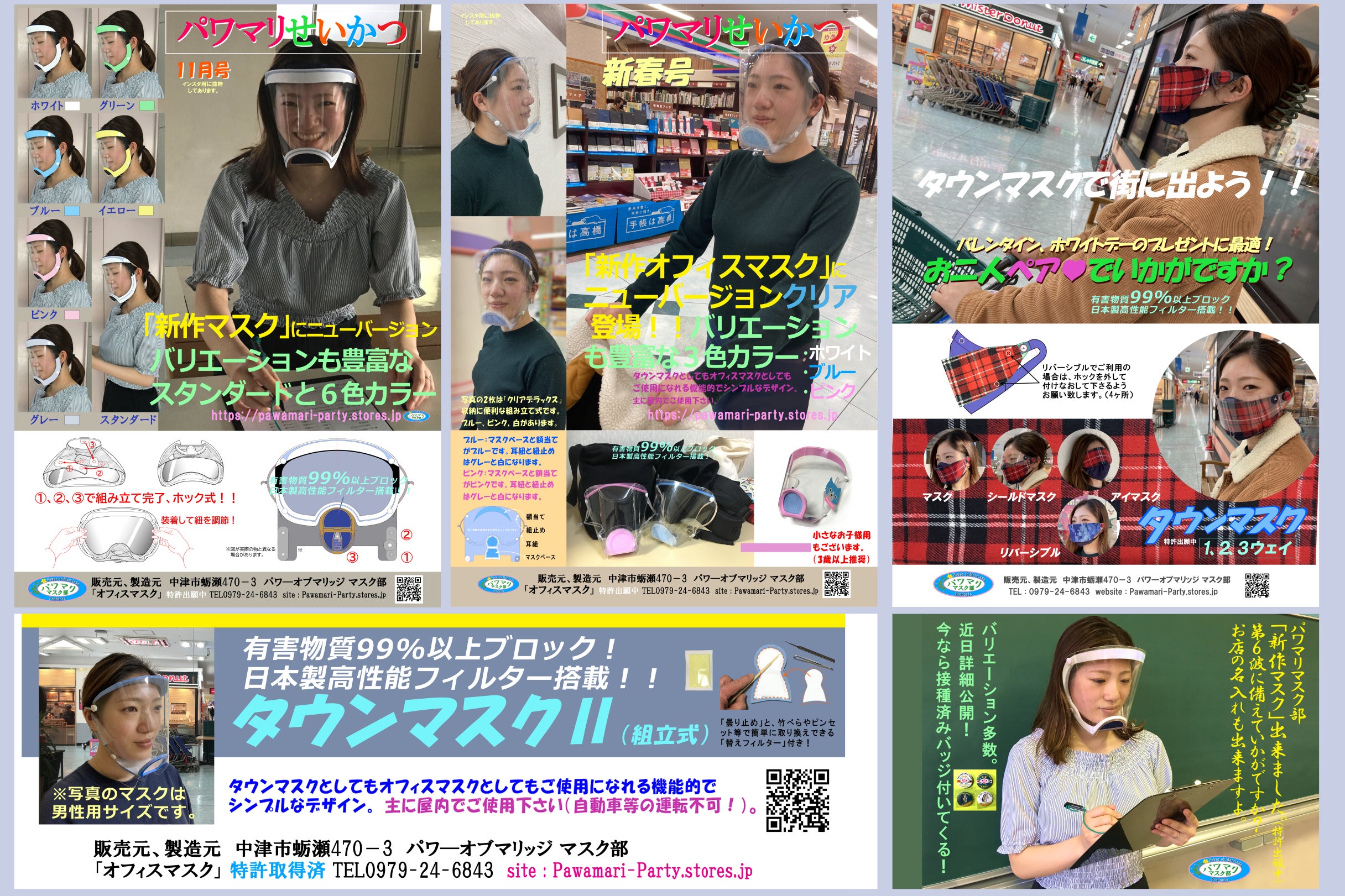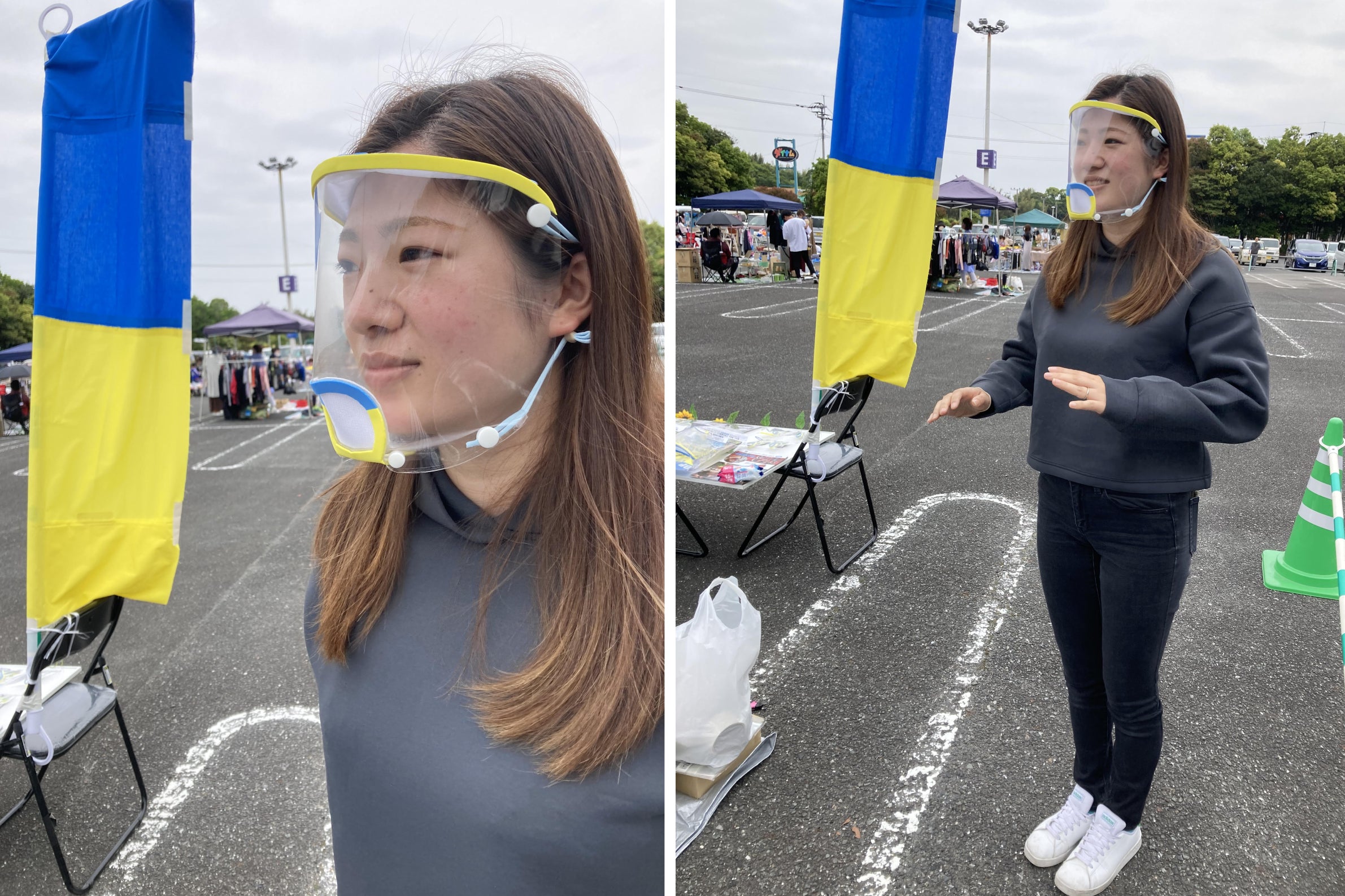 フェイスシールドとマスクを一体化させた、顔をスッポリ覆う見た目スマートなマスクです。名前は「タウンマスクⅡ(折り畳み式)」です。ほかにタウンマスクⅢとオフィスマスク、タウンマスクⅣ(マルチウェイマスク)の3種類と子供用サイズ、幼児用があります。動画では折りたたみ式のマスクを紹介しています。