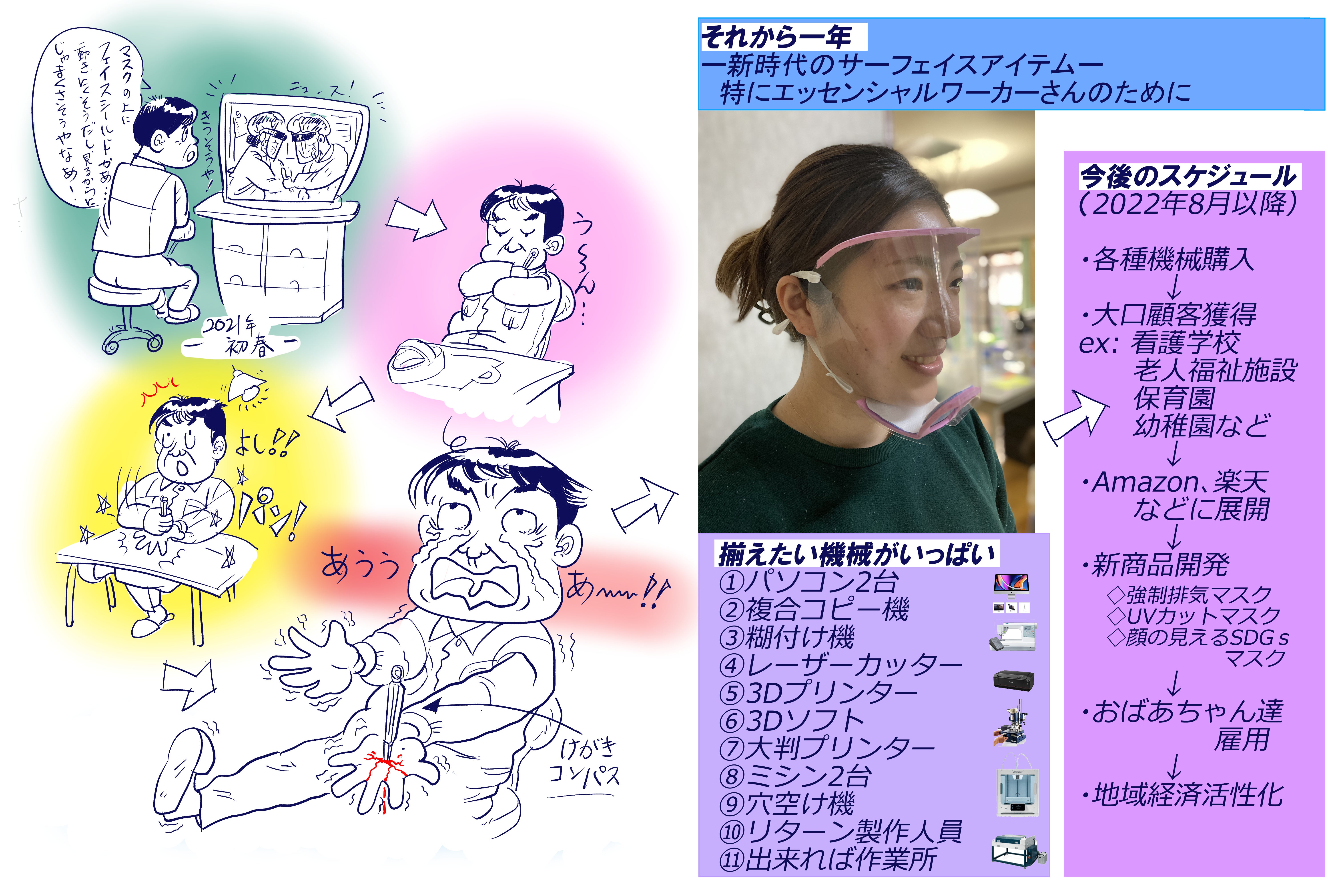 タウンマスク誕生までを「プロジェクトの目的」の欄に社長が書いたマンガで説明しています。思い付きは良かったのですが、それから結構苦労しています。その変遷もお見せします。