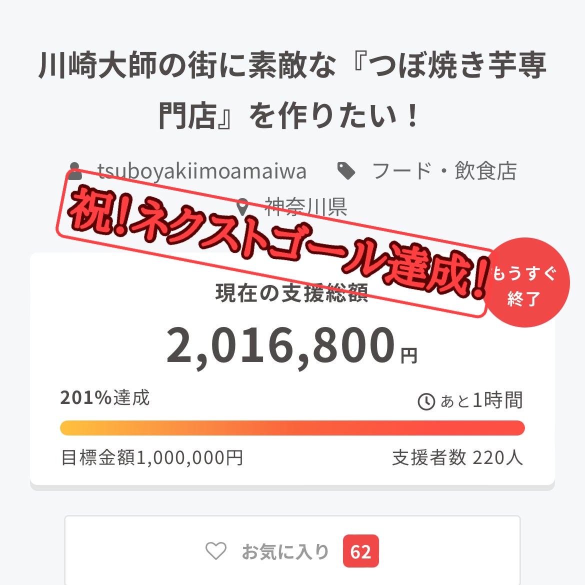 皆さまこんにちは!!昨日、7月9日にクラウドファンディングを終えることが出来ました!最終的に支援総額:2,037,800円支援者数:222人となり、ネクストゴールであった目標を上回る達成率203%で終了致しました!!改めて支援、拡散、応援頂いた皆様有難う御座います。新店舗の準備も着々と進んでいますが…当初8月頭のオープンを予定していました。しかし、工期が遅れているため8月20日頃のオープンとなりそうです。進捗状況もまた共有させて頂きますね!是非楽しみにお待ち頂けますと嬉しいです。これからもご報告することがたくさん出てくる予定なのでまた更新します!最後に、新店舗がオープンしましたら是非川崎大師へ遊びに来てください。一緒につぼ焼き芋を楽しみましょう!本当にありがとうございました!