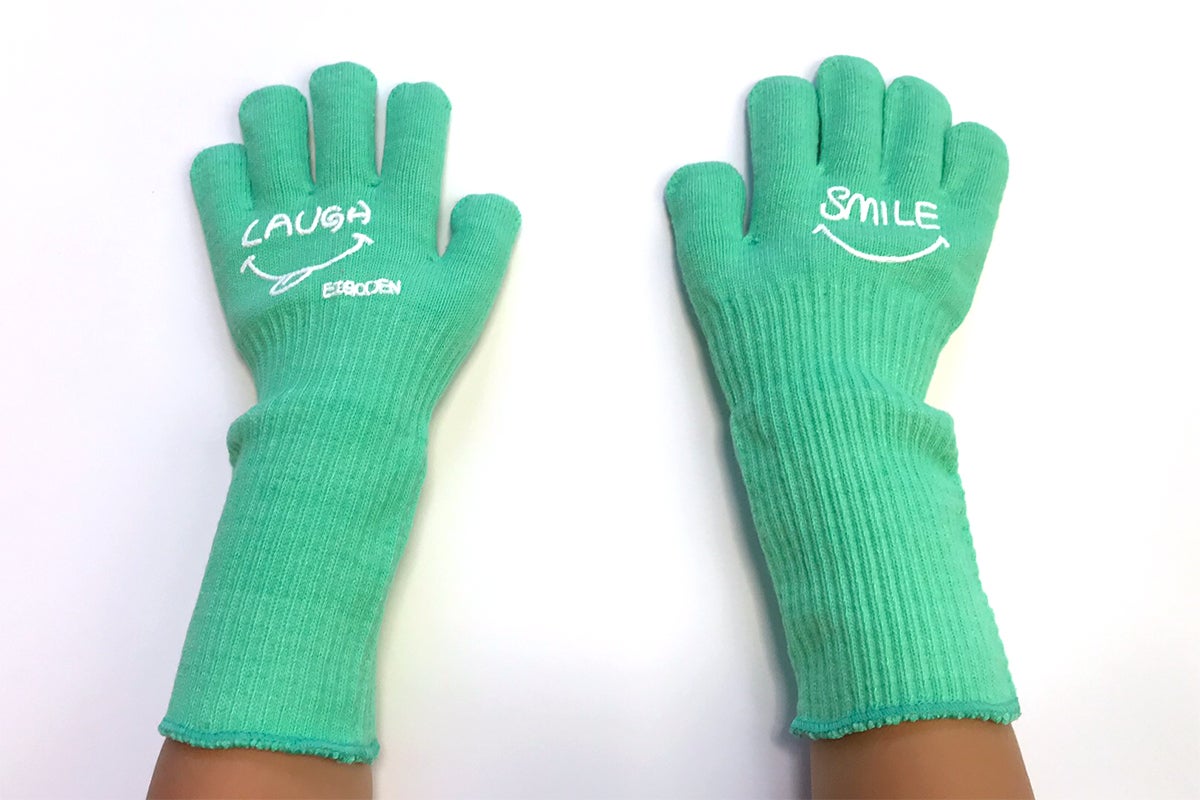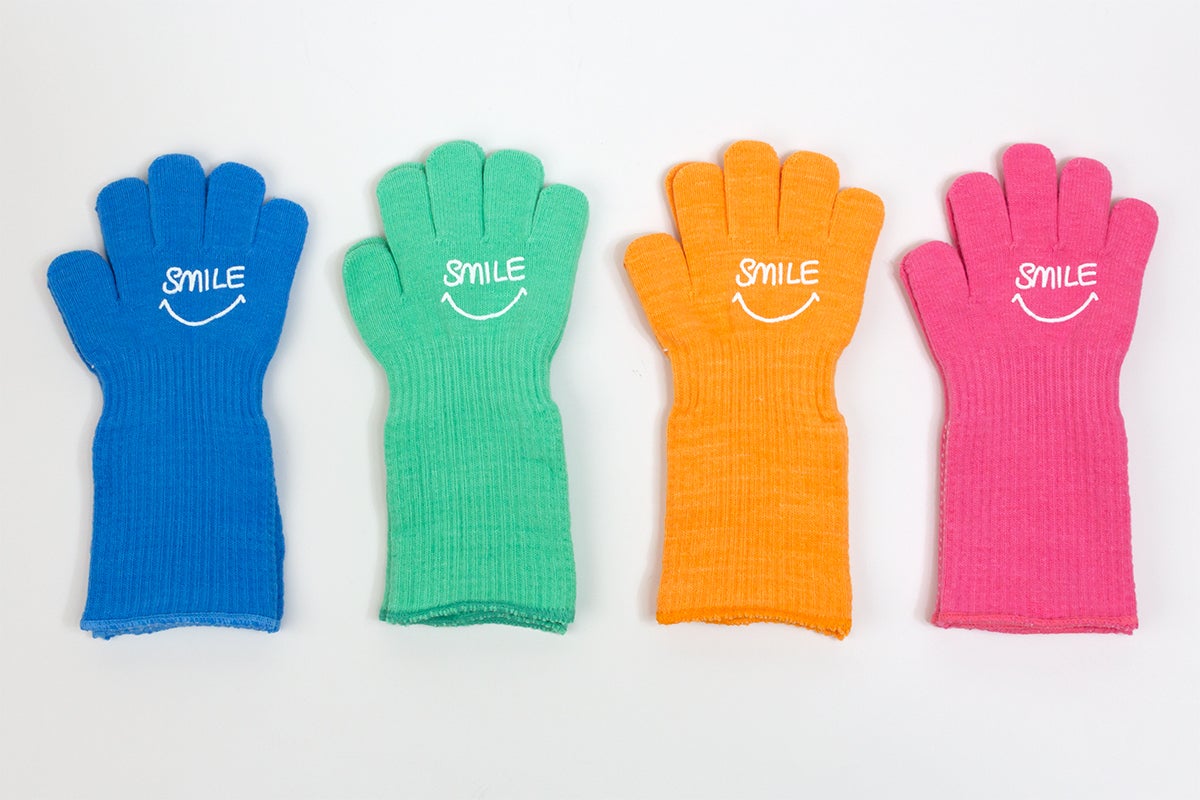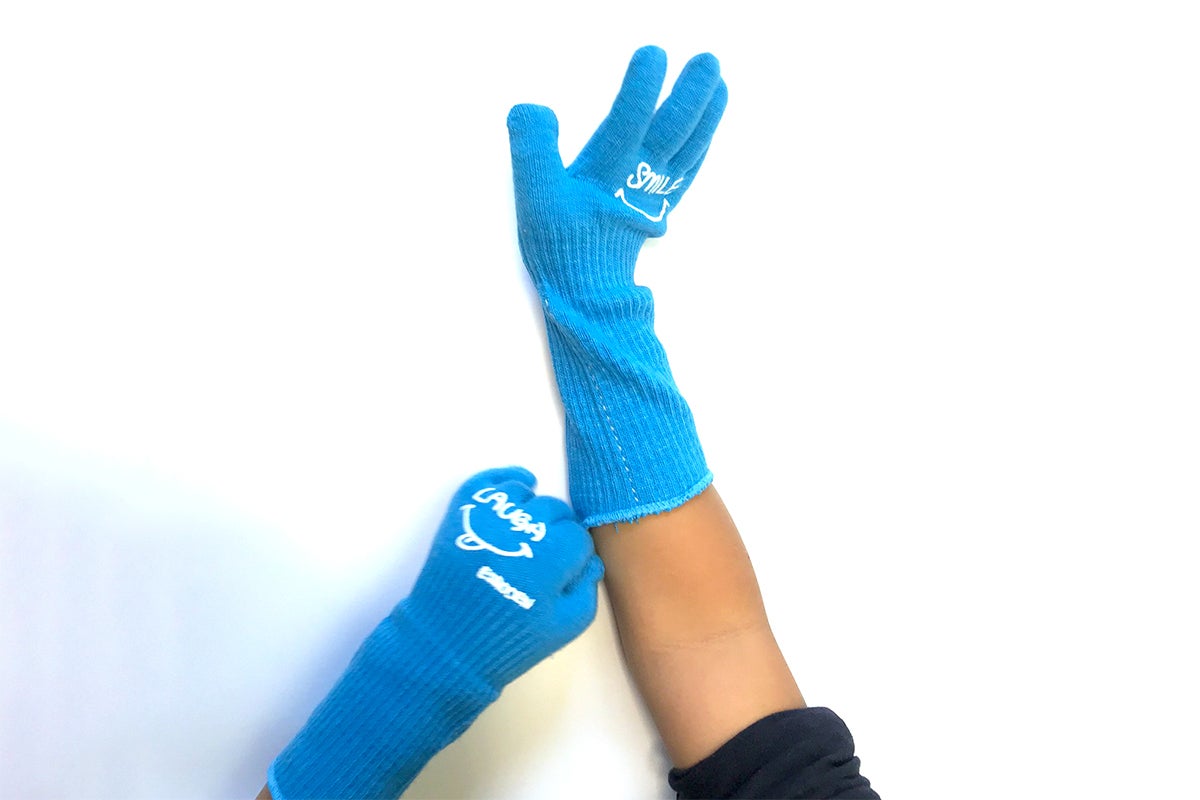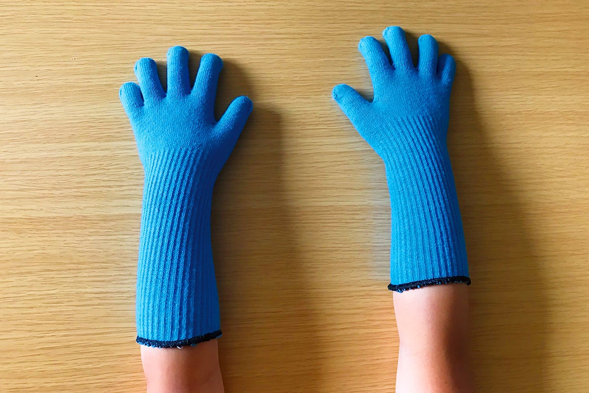 試行錯誤の結果、普通の手袋よりも手首から上腕までが長く、脱げにくいデザインになりました。