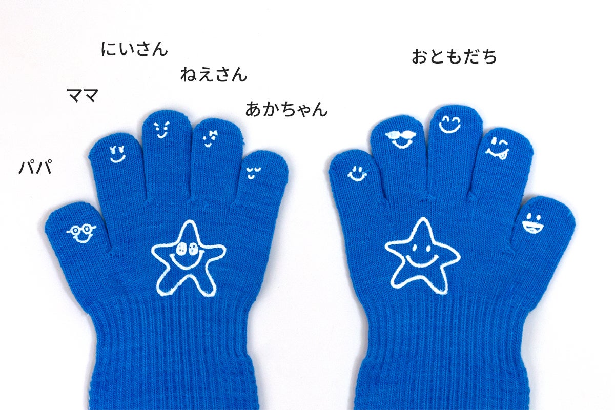 指先には、指の歌遊び「おはなしゆびさん」を楽しめるイラスト入り。(滑り止めゴム素材)