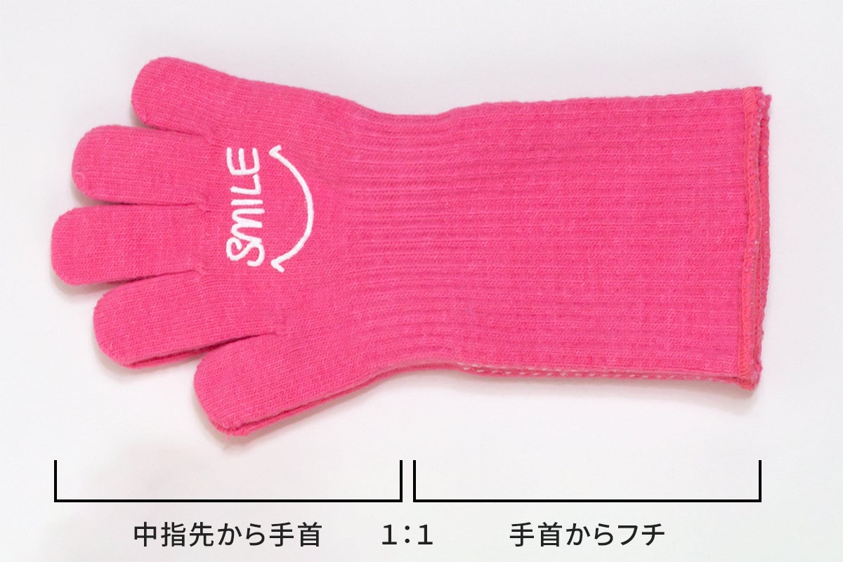 試作を何度も繰り返し、中指先から手首まで、手首からフチまでの長さが同じ長さ・形状が最も脱げにくく、動きやすい快適な形だとわかりました。フチまでが長すぎると動きにくく、違和感があるようで幼児が嫌がります。