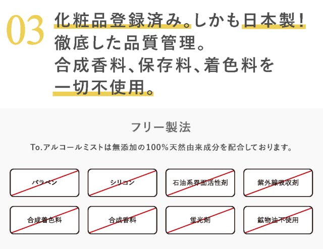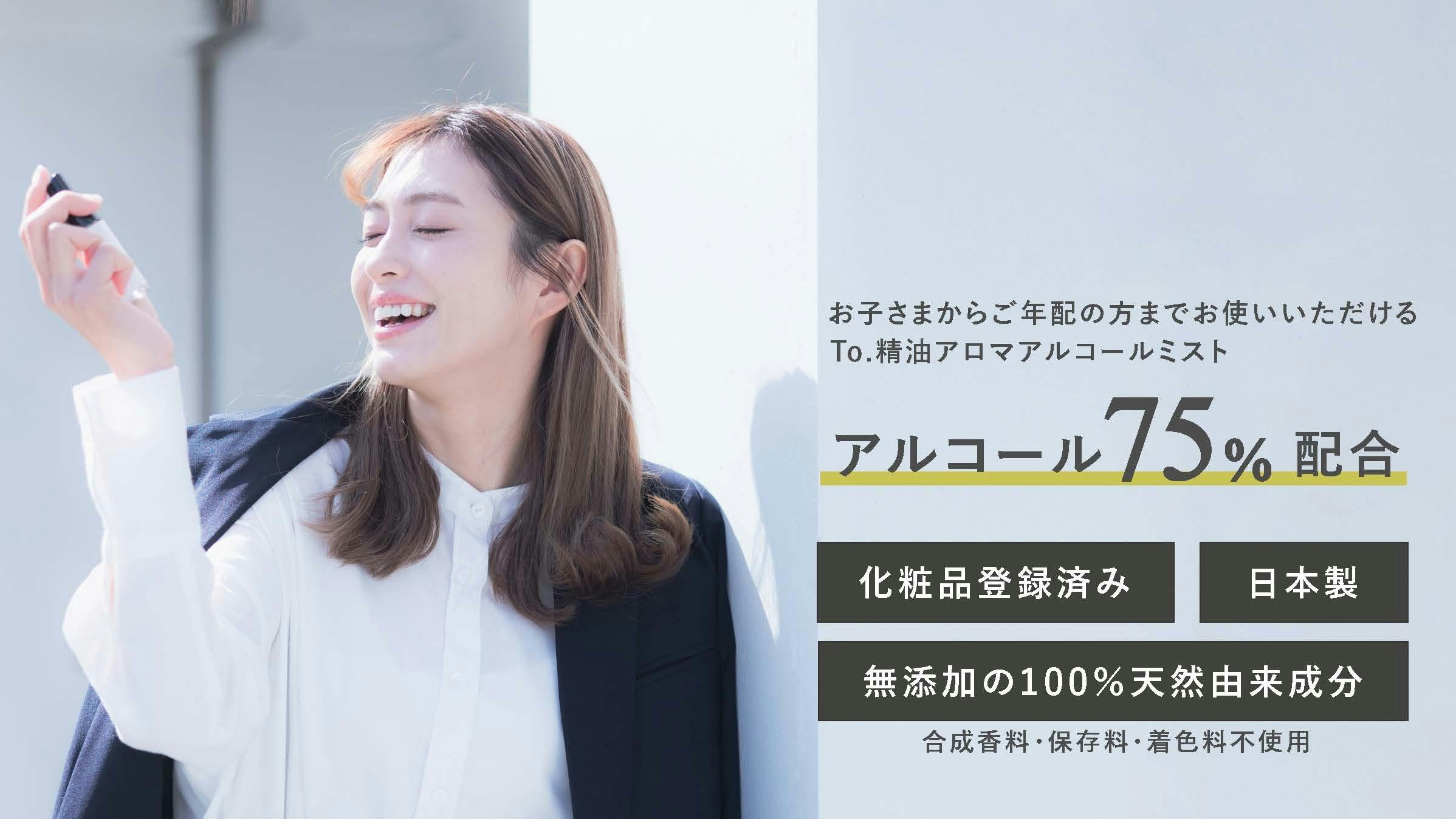 『TO.』はアロマ老舗ブランドが作る化粧品認可のおりた今までなかった新ジャンルとなる天然精油のアロマアルコール75%のミストです。日本製で保存料・合成香料など添加物を一切使用していないミストなのでお子さまからご年配の方までお使いいただけます。