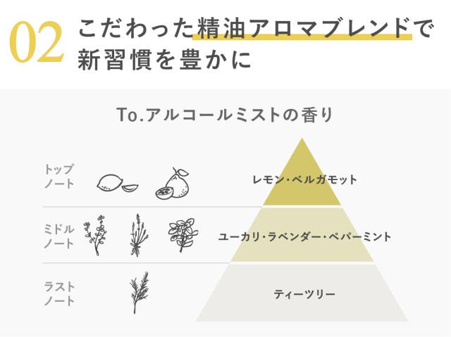 毎日の欠かせないアルコール噴霧が精油アロマで癒しを感じる幸せな時間に。すこしでも癒しの時間をお届けすることにこだわり、レモン、ティーツリー、ユーカリ、ベルガモット、ラベンダー、ペパーミントの6種類の精油をブレンドしました。