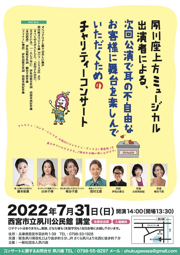 内容: 夏にちなんだ季節の歌、カルメンや蝶々夫人等からのオペラアリア、夙川座オリジナル曲、「ザザ ボーヴォワールの永遠の恋人」からの歌など。 盛りだくさん!