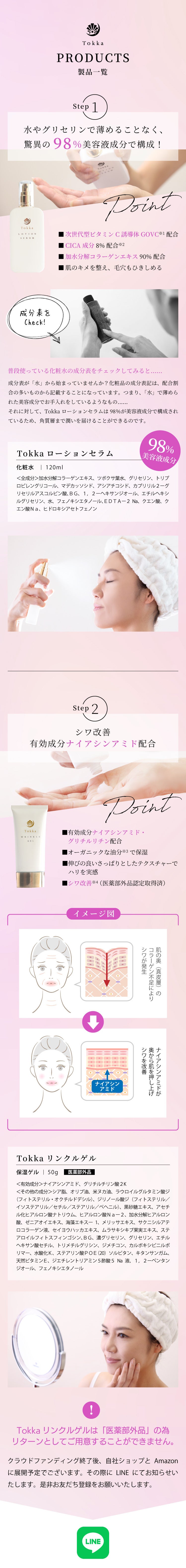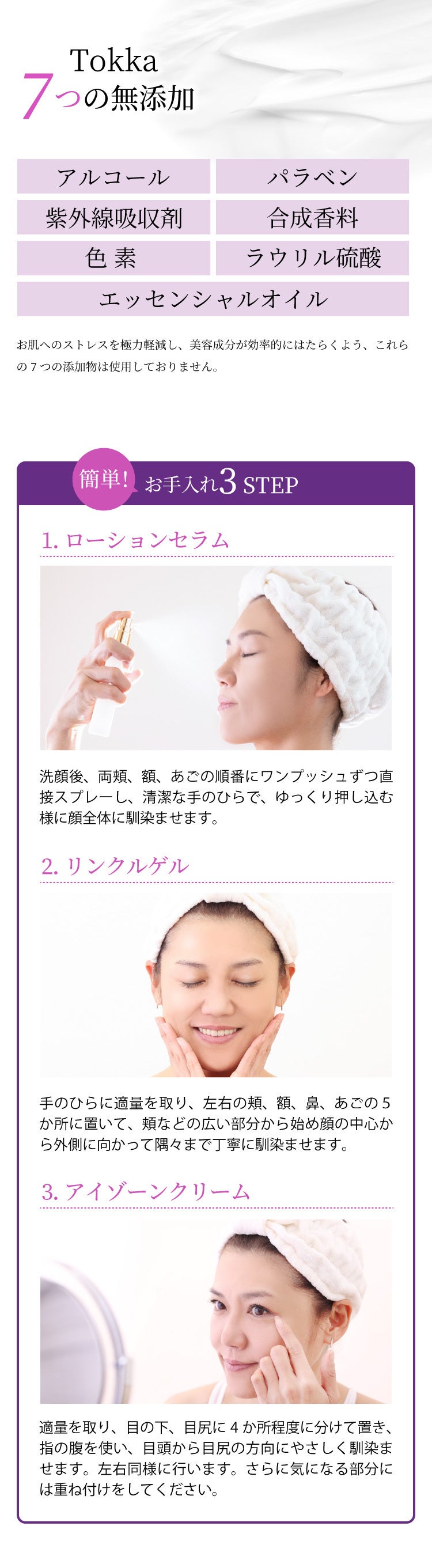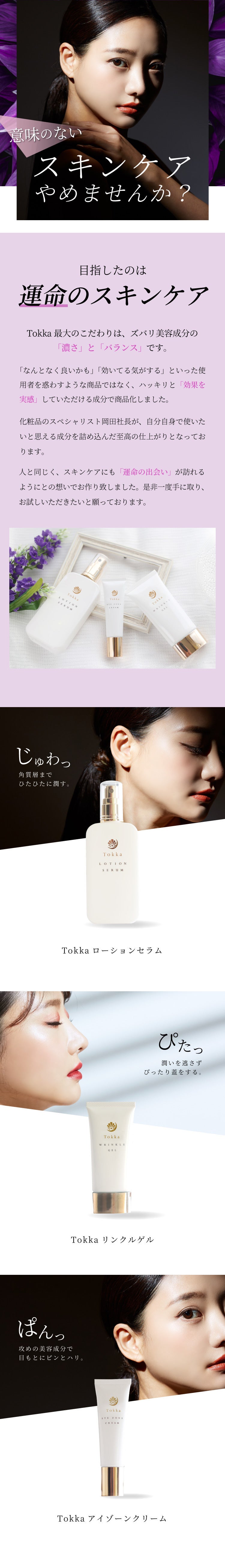 私たちも、周りの方にも使っていただき「本当に効果があるのか」これだけを追い求め、商品化したのが今回の「Tokkaローションセラム」「Tokkaリンクルゲル」「Tokkaアイゾーンクリーム」です。スタッフが体験を通し、自信をもってオススメできる商品となっております。