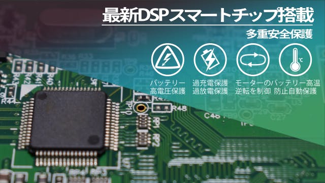 DSPスマートチップで、バッテリーの過充電・過放電・高温・高電圧、モーターの逆回転防止機能を搭載。多重安全保護を実現しました。