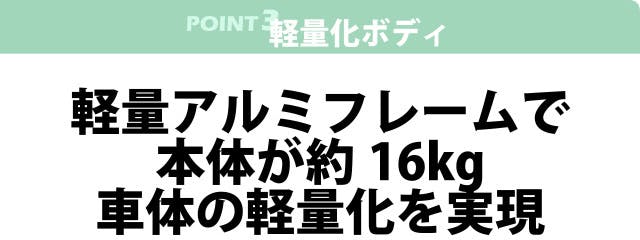 軽量アルミフレームで本体の重さが約16kgと、軽量化を実現。