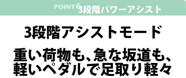 3段階のハイパワー電動アシスト、重い荷物を載せても漕ぎ出しから安定感抜群!