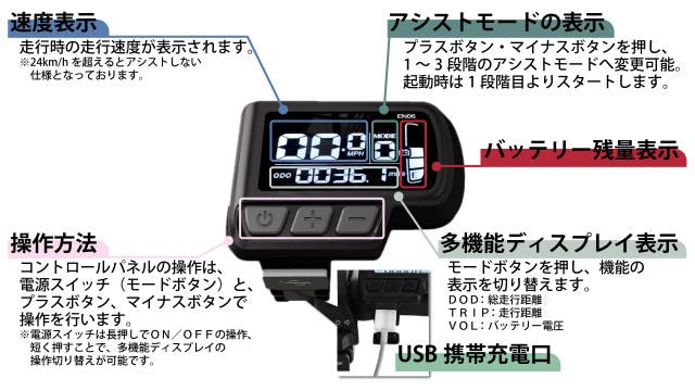 ハンドルに取り付けたコントロールパネルでお好みのアシストパワー(3段階)を設定できます。時速、走行距離、バッテリー残量などもご確認いただけます。