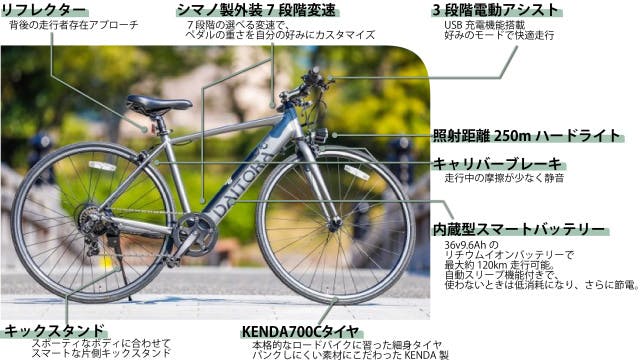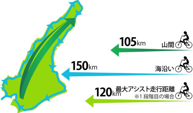 アシスト可能最大距離が120kmあるので、疲れたらアシスト機能を使い快適完走!