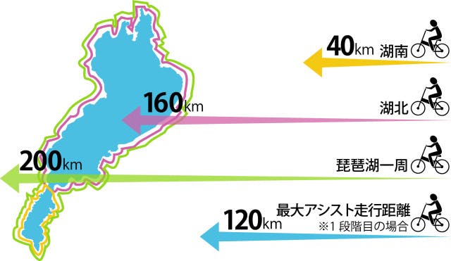 琵琶湖一周は約200km、湖北で160km、湖南で40kmと選べるルートで好みの距離を走れます。