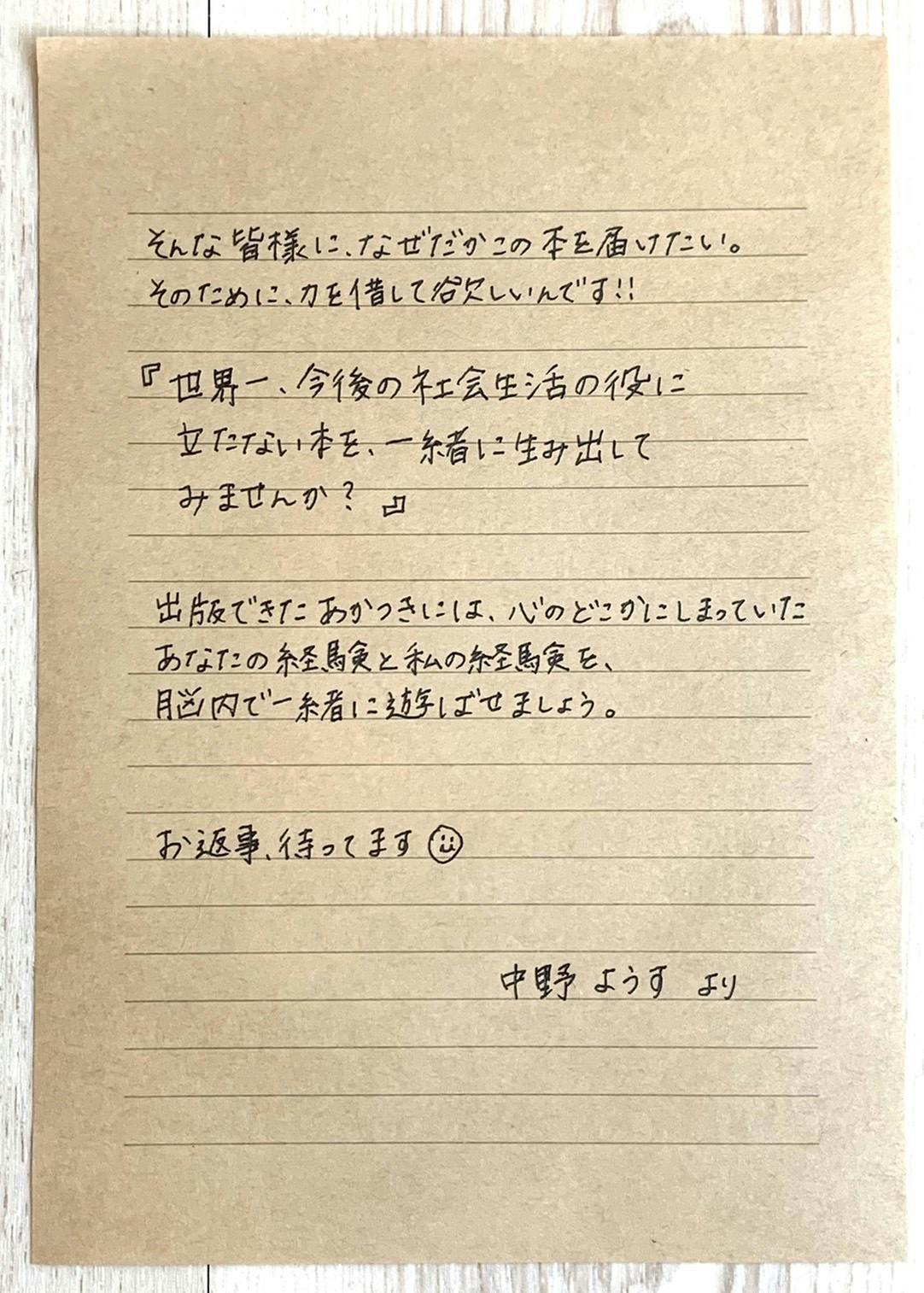 今回出版を目指すこの本は、文学界の人、有名人、何かを成し遂げた人、偉人達、そのすべての人が書くことができないのです。その人たちには、もうどんな人となりの何者なのか、という前情報があります。